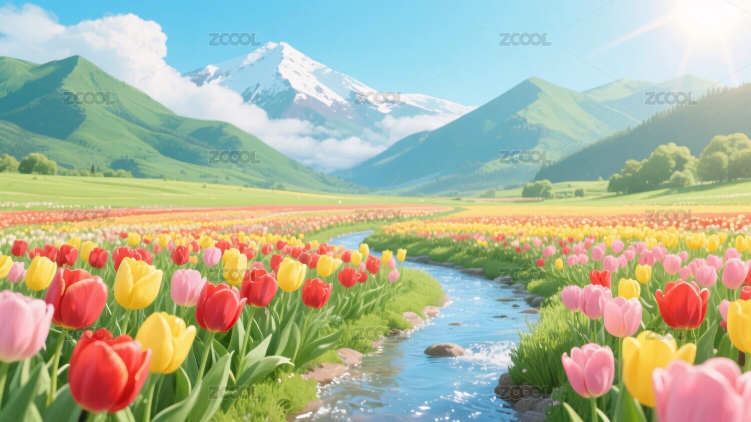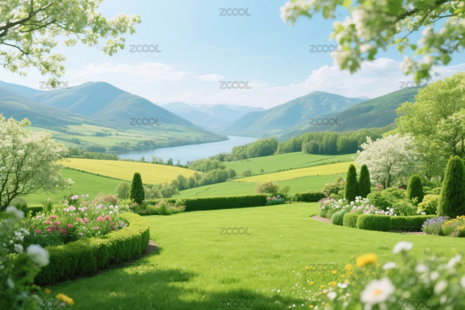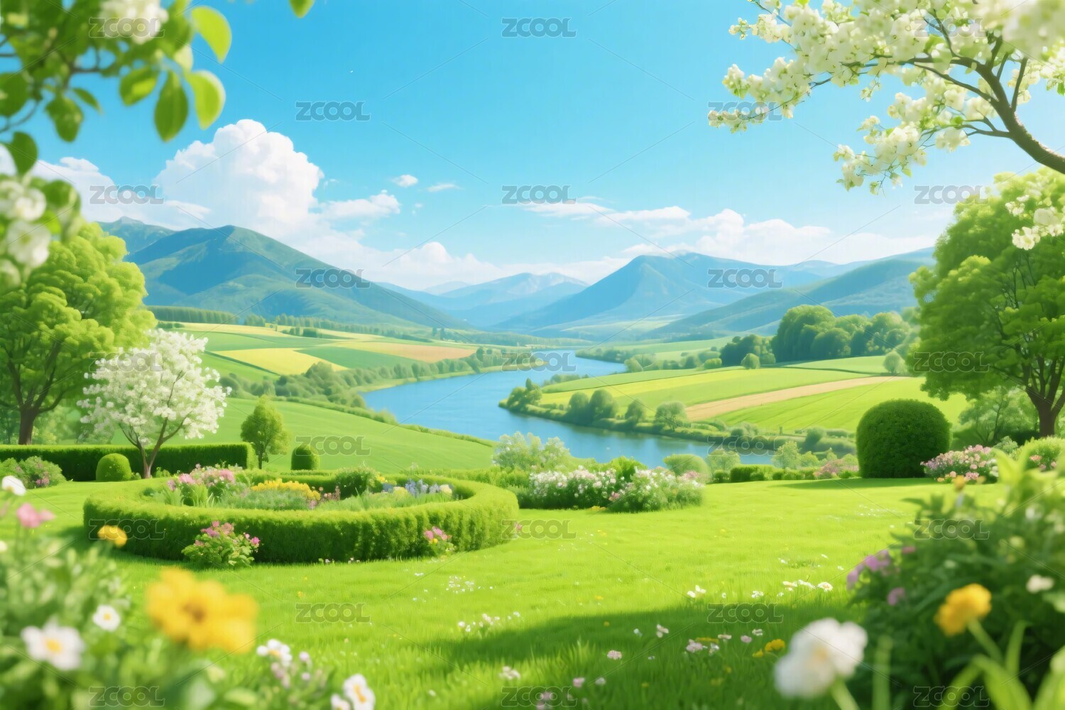 风车,花田,花卉,田园,蓝天,树木,风景,自然,插画,背景