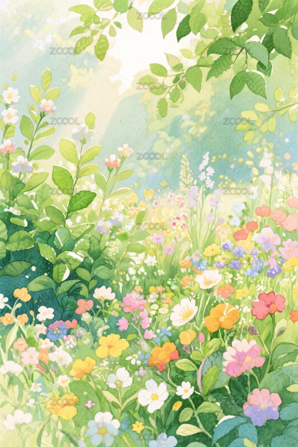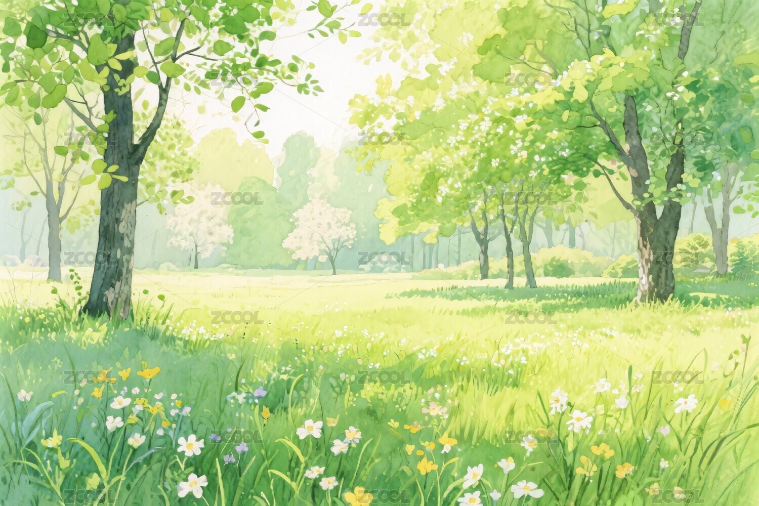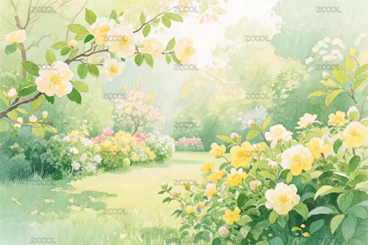 花朵,花园,树木,草地,自然,清新,宁静,插画,水彩,风景