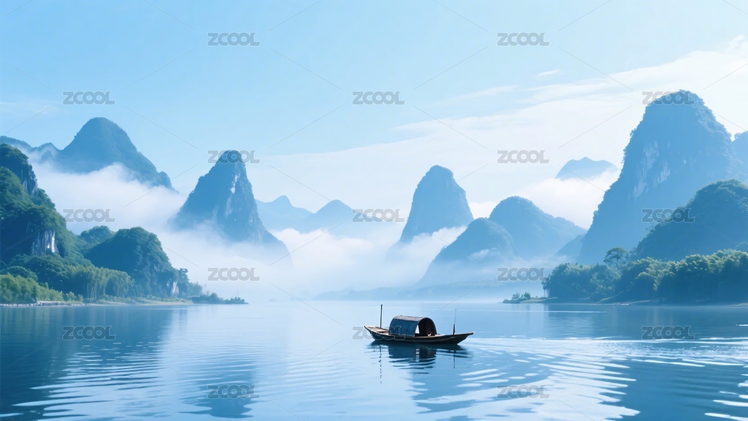 山水,风景,湖水,小船,白云,山峦,青山,绿水,自然,风景画