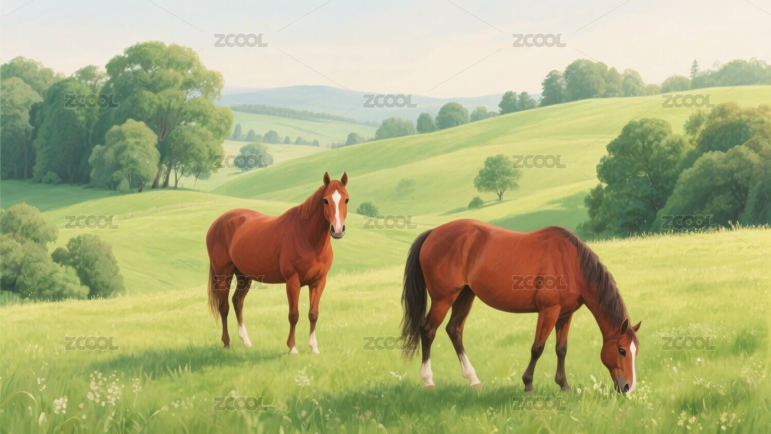 马群,草原,山峦,插画,自然,田园,动物,风景,牧区,田园风光