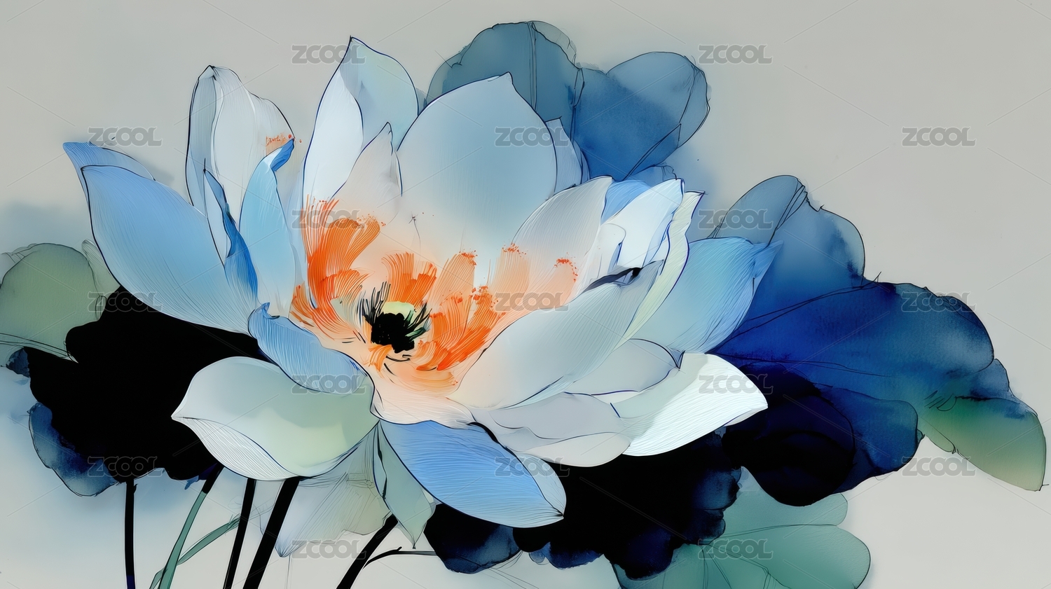 水墨风格的蓝色莲花