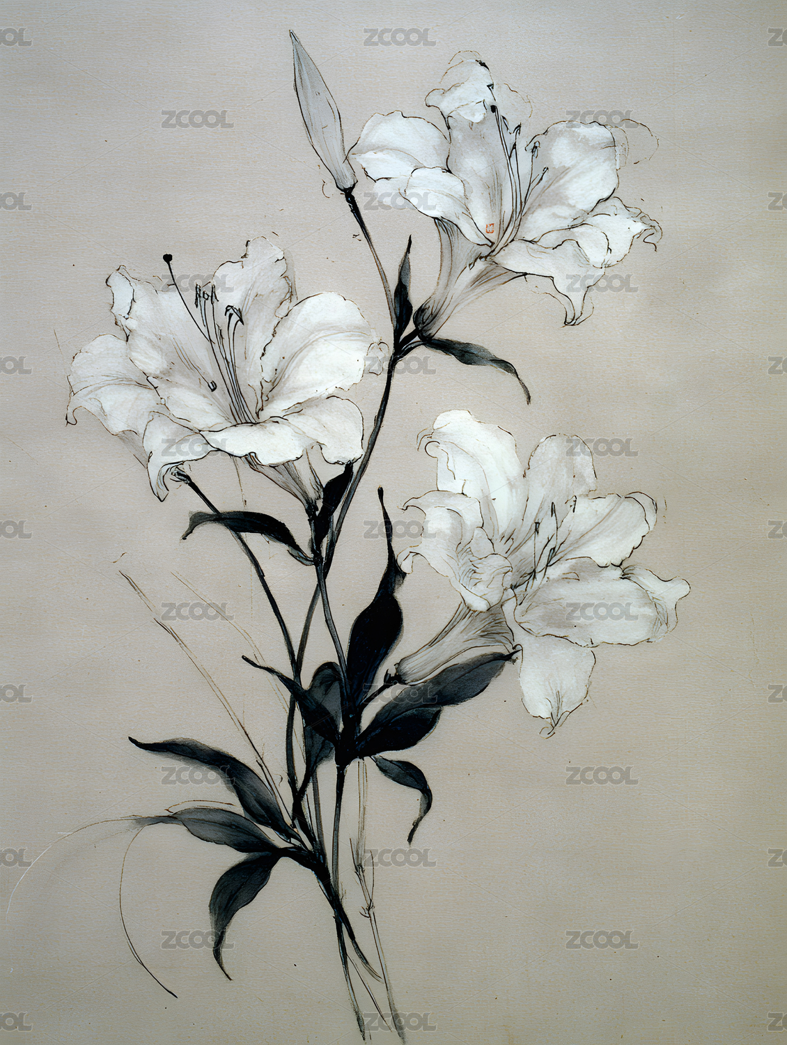 水墨绘就的三朵绽放百合花