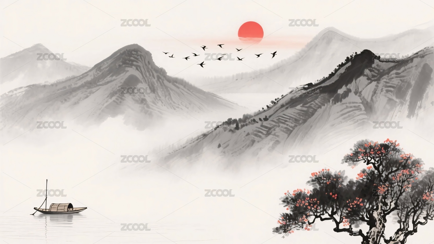 山水,月亮,飞鸟,小船,红梅,插画,意境,自然,风景,水墨