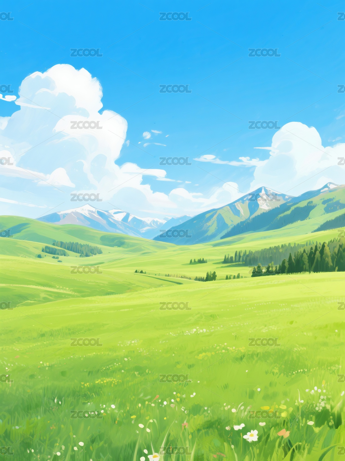 清新明亮绿色辽阔草原起伏的雪山插画绘画