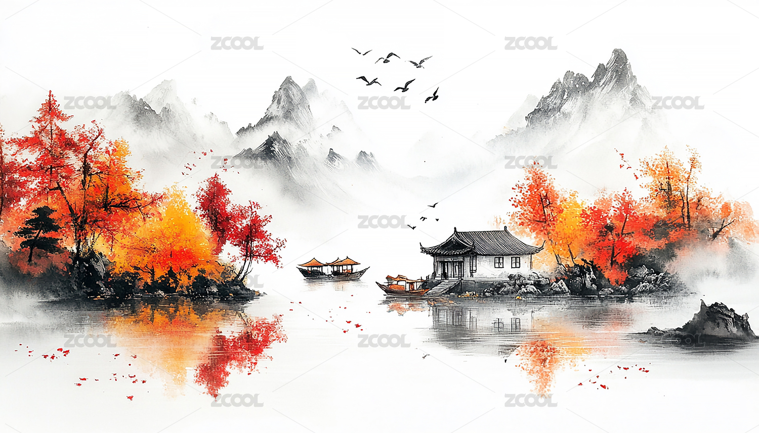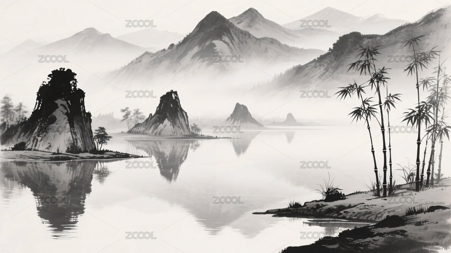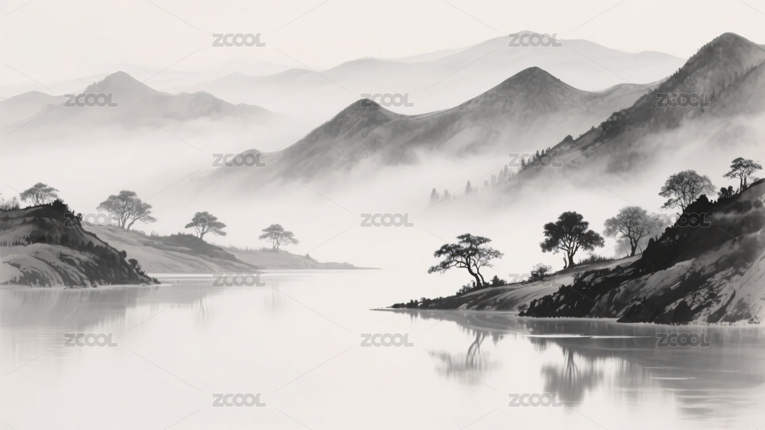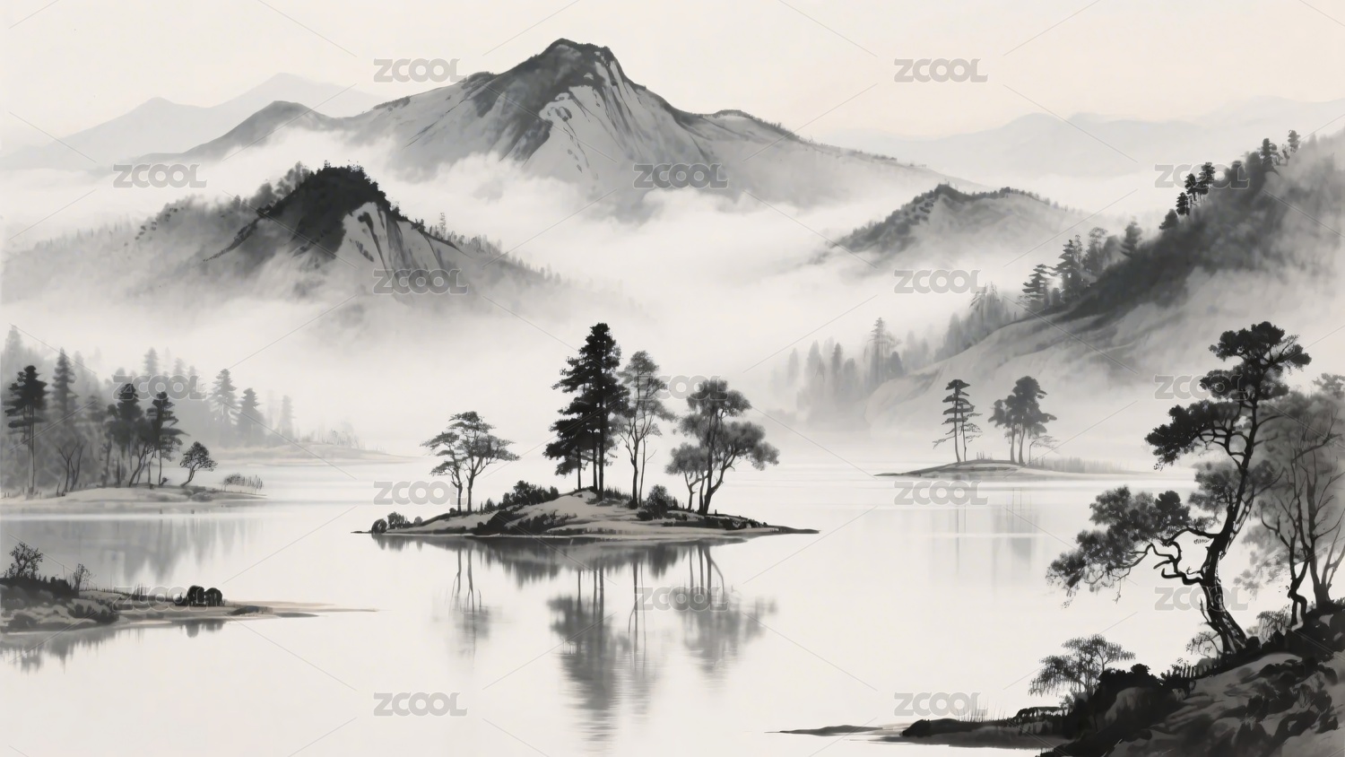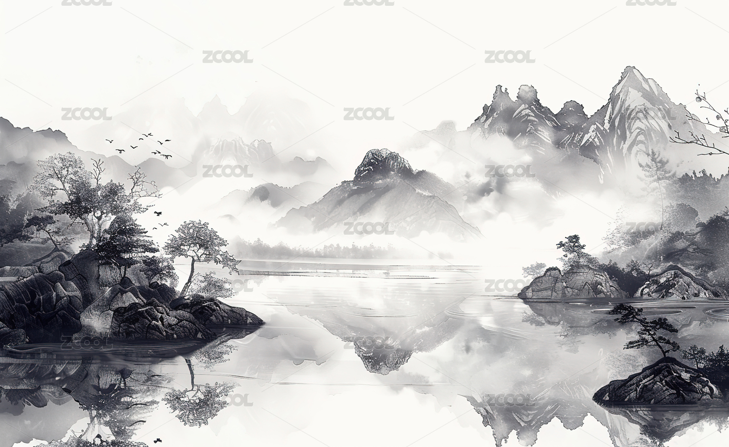 山水,树木,飞鸟,水墨,风景,插画,意境,自然,中式,淡雅