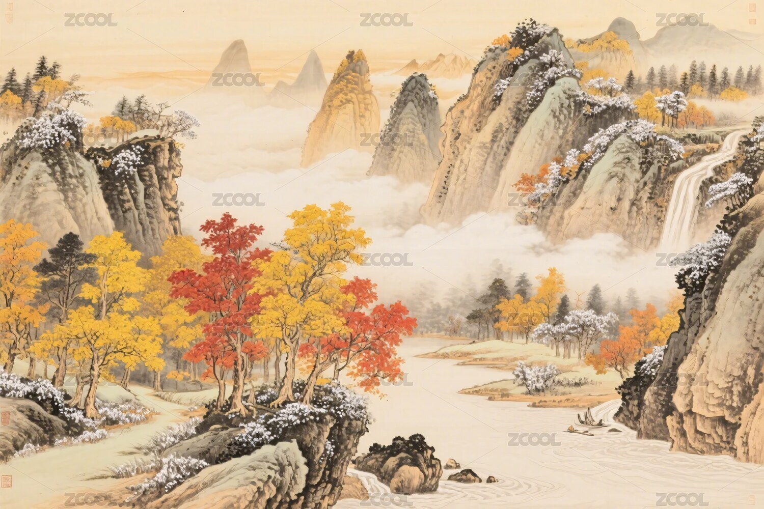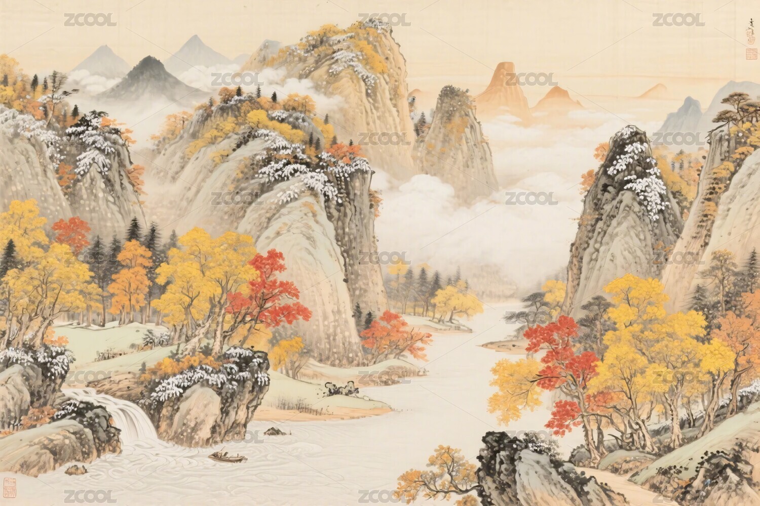 山水,飞鸟,秋树,雾气,水墨画,插画,自然,风景,意境,中式