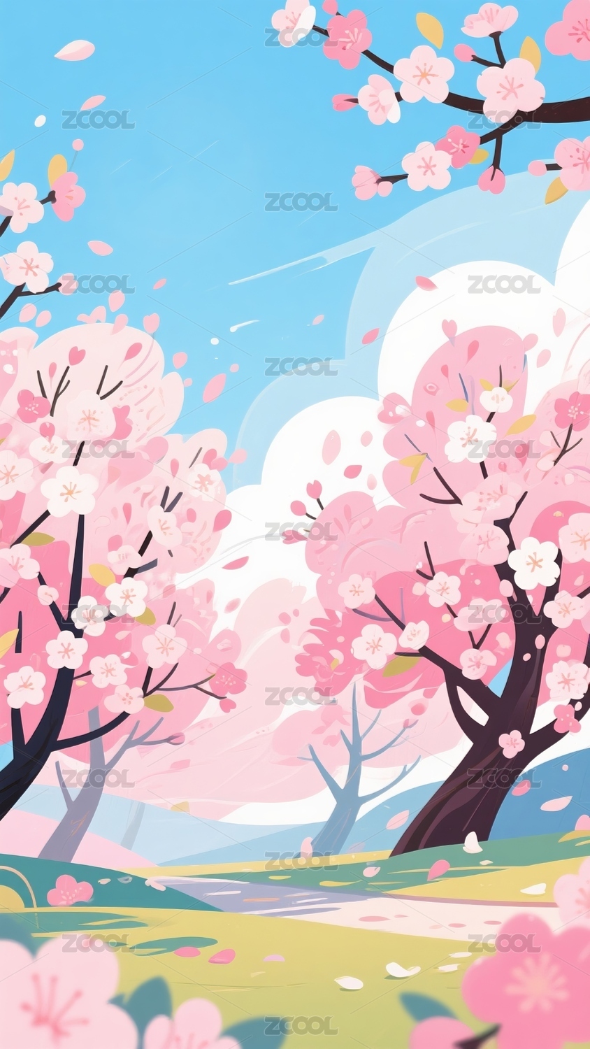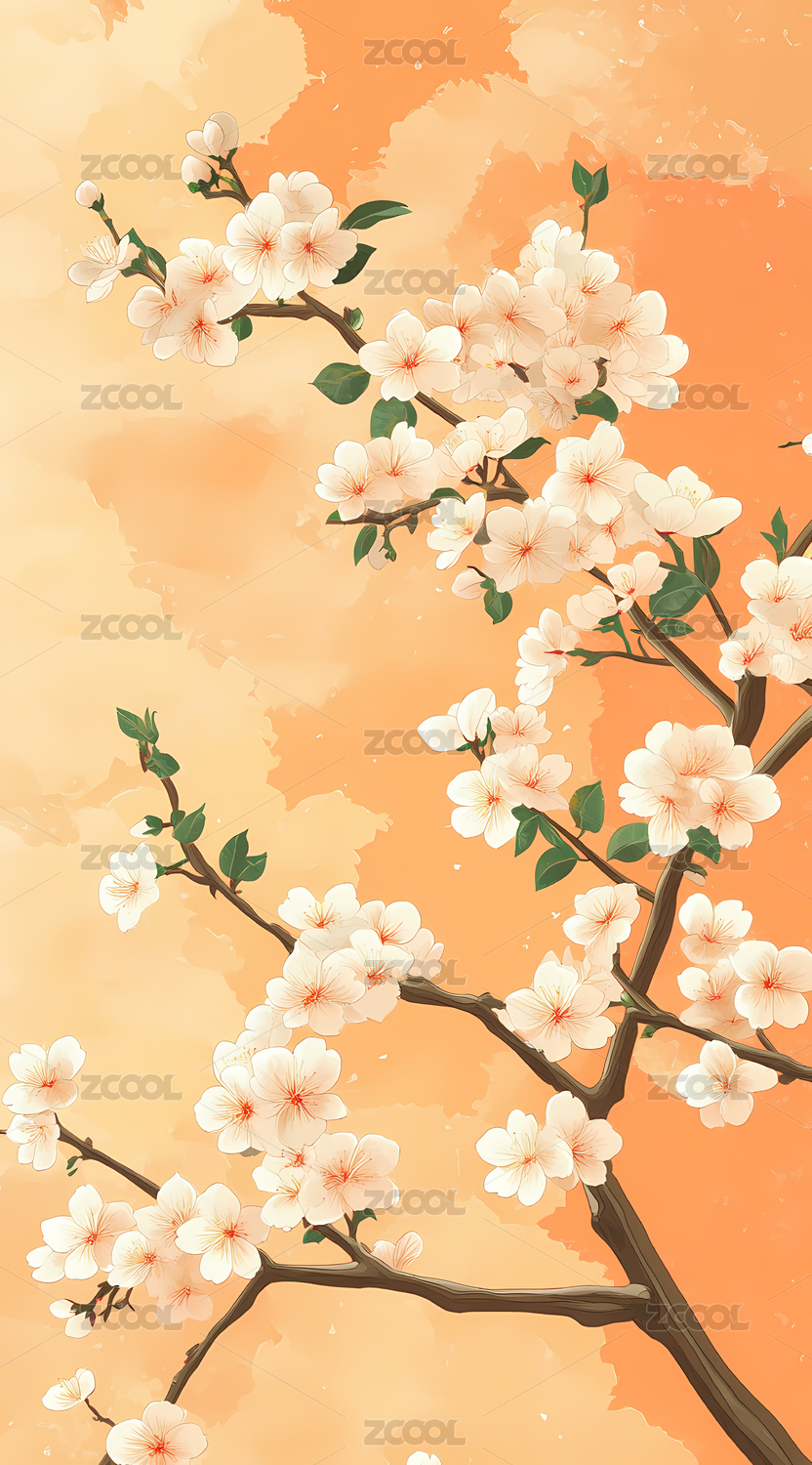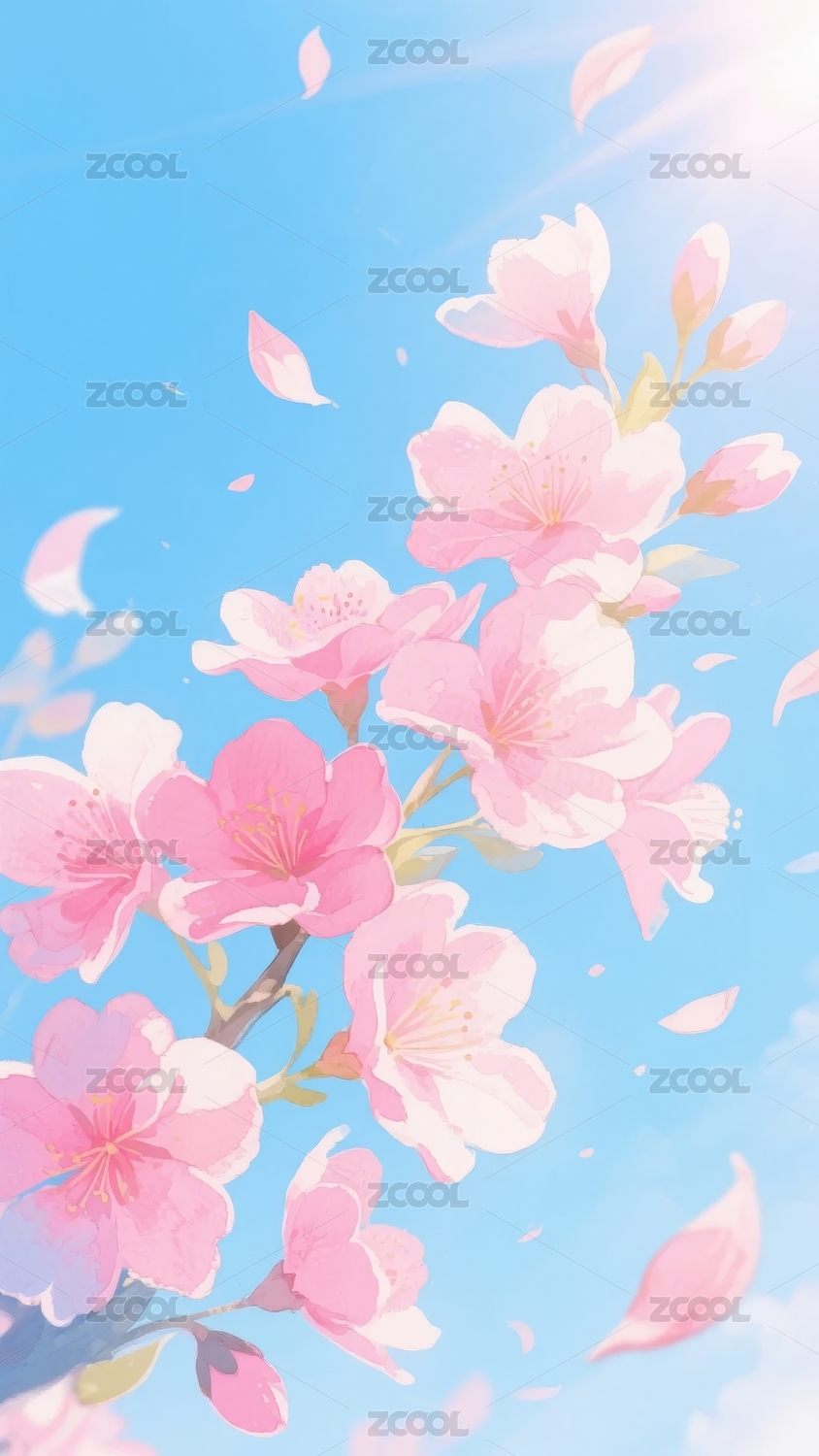 花朵,树枝,绿叶,蓝天,白云,雪花,插画,清新,自然,植物