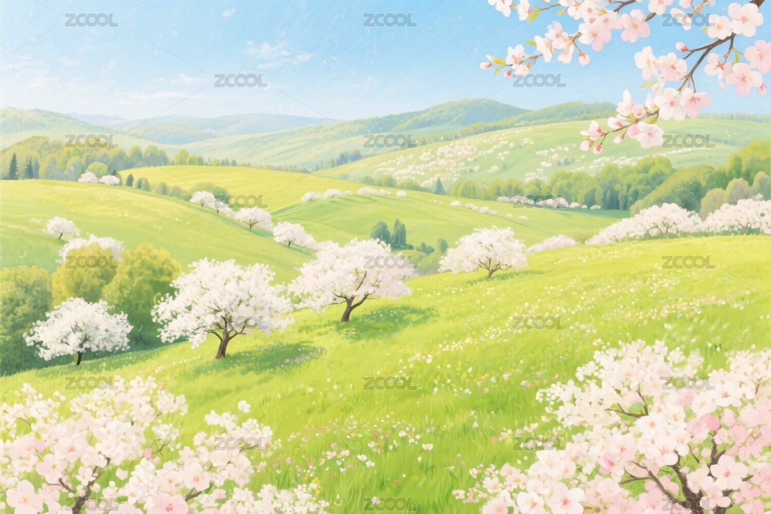 樱花,太阳,草地,花朵,插画,风景,自然,春天,粉色,唯美