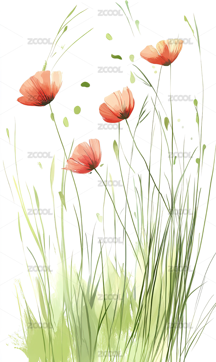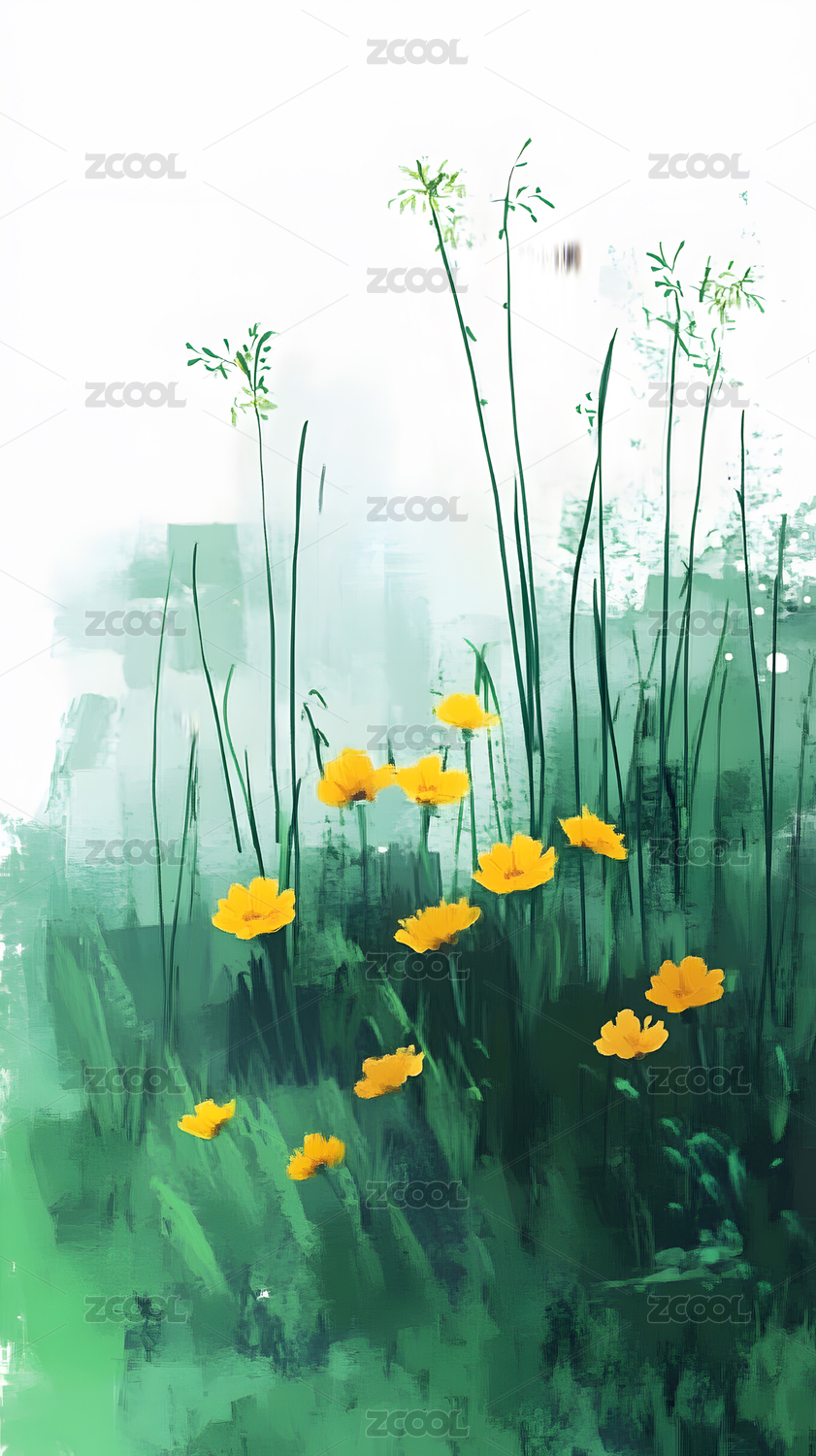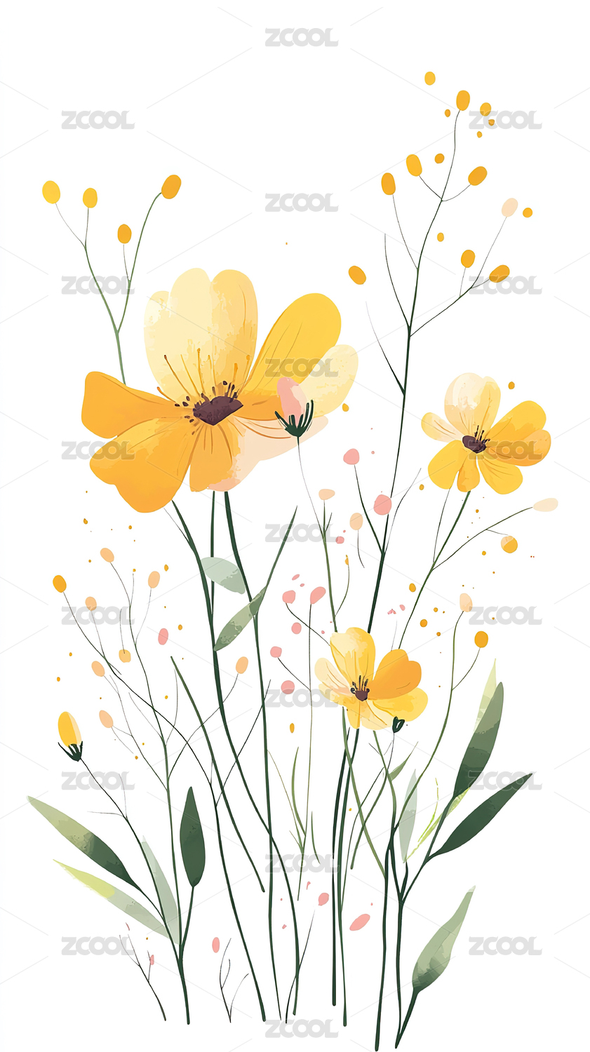 水彩风格黄色花朵与青草