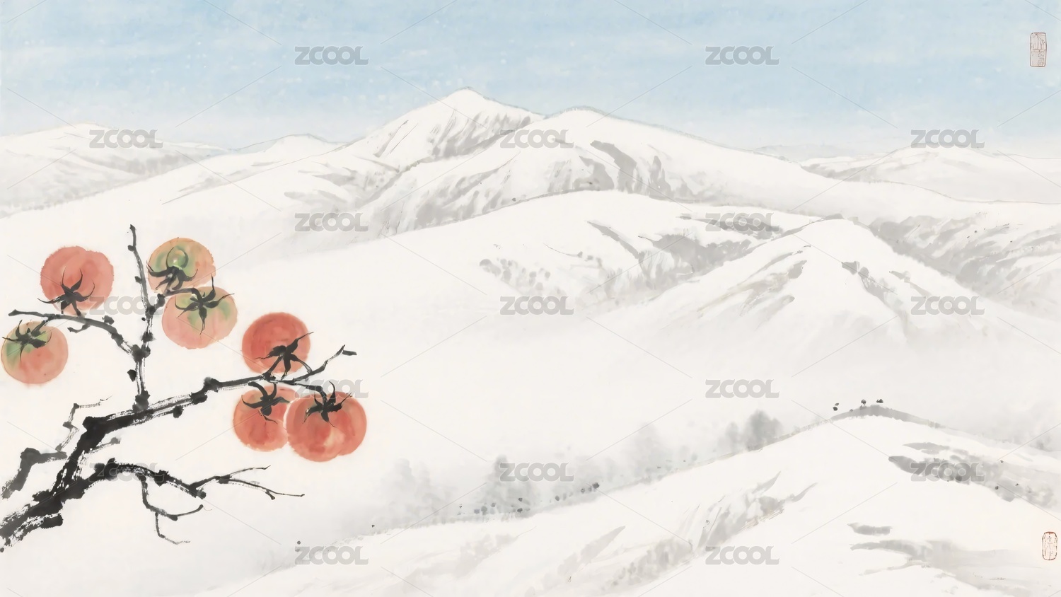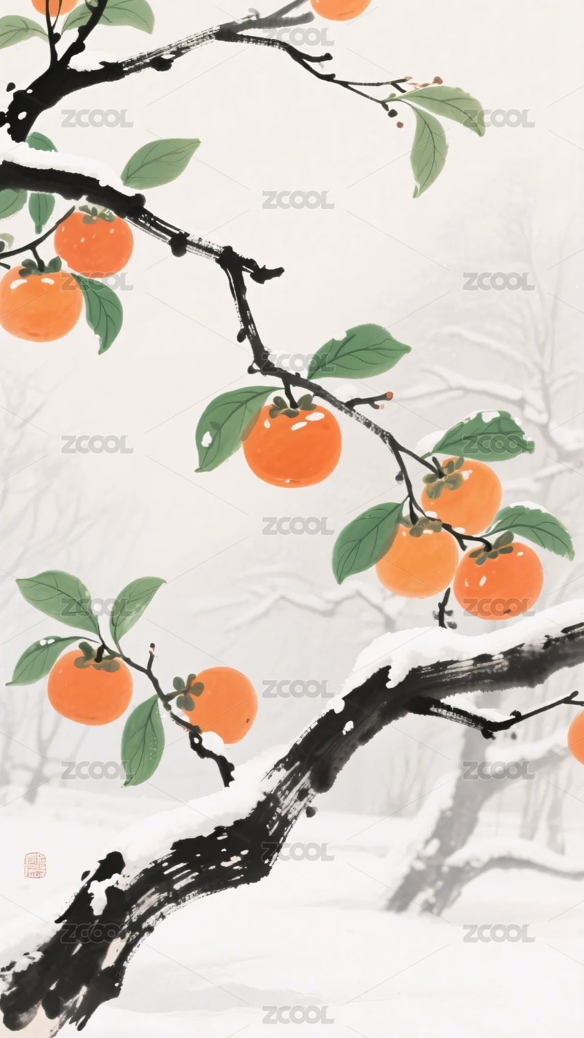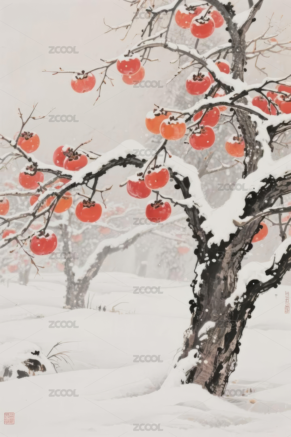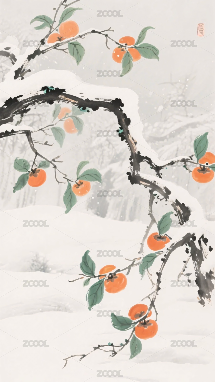雪中红柿中式山水景象
