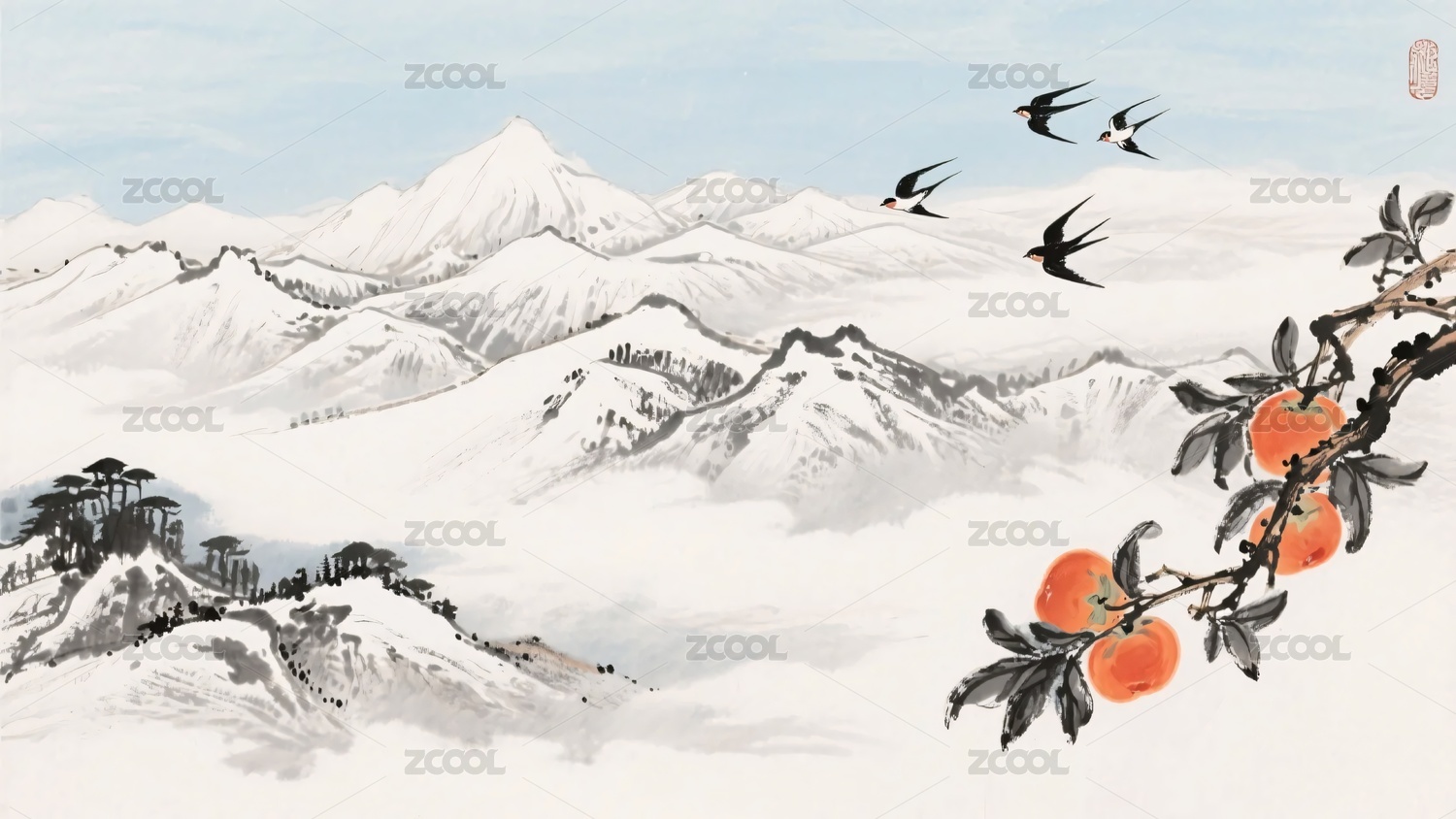 水墨山水间的柿子与飞鸟图
