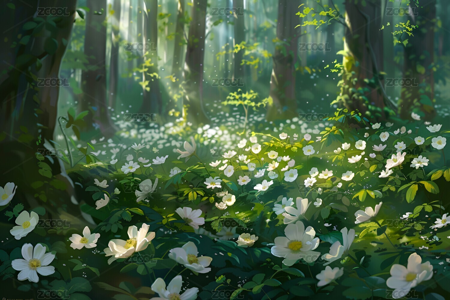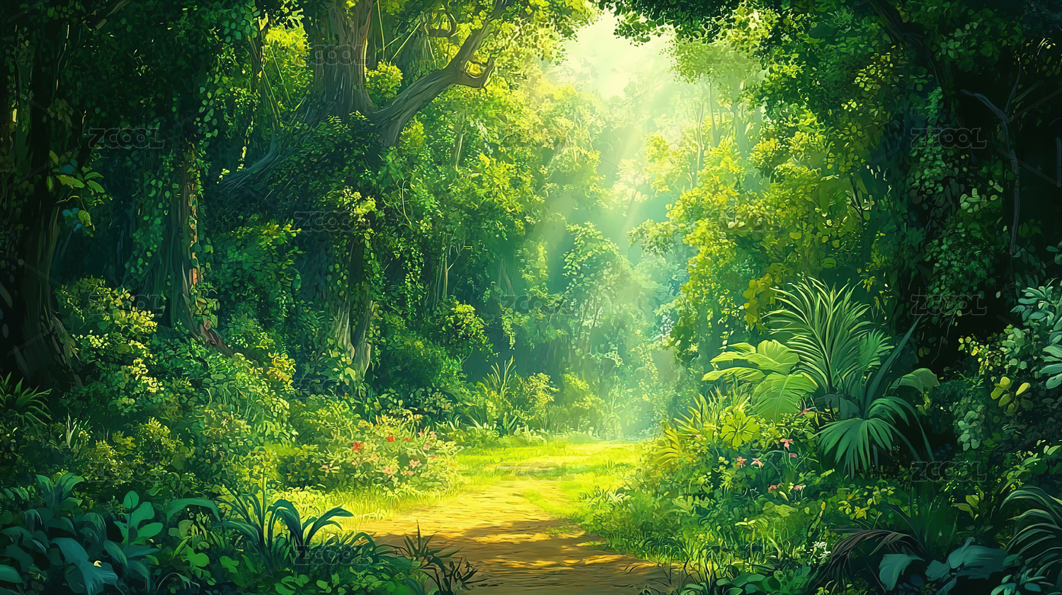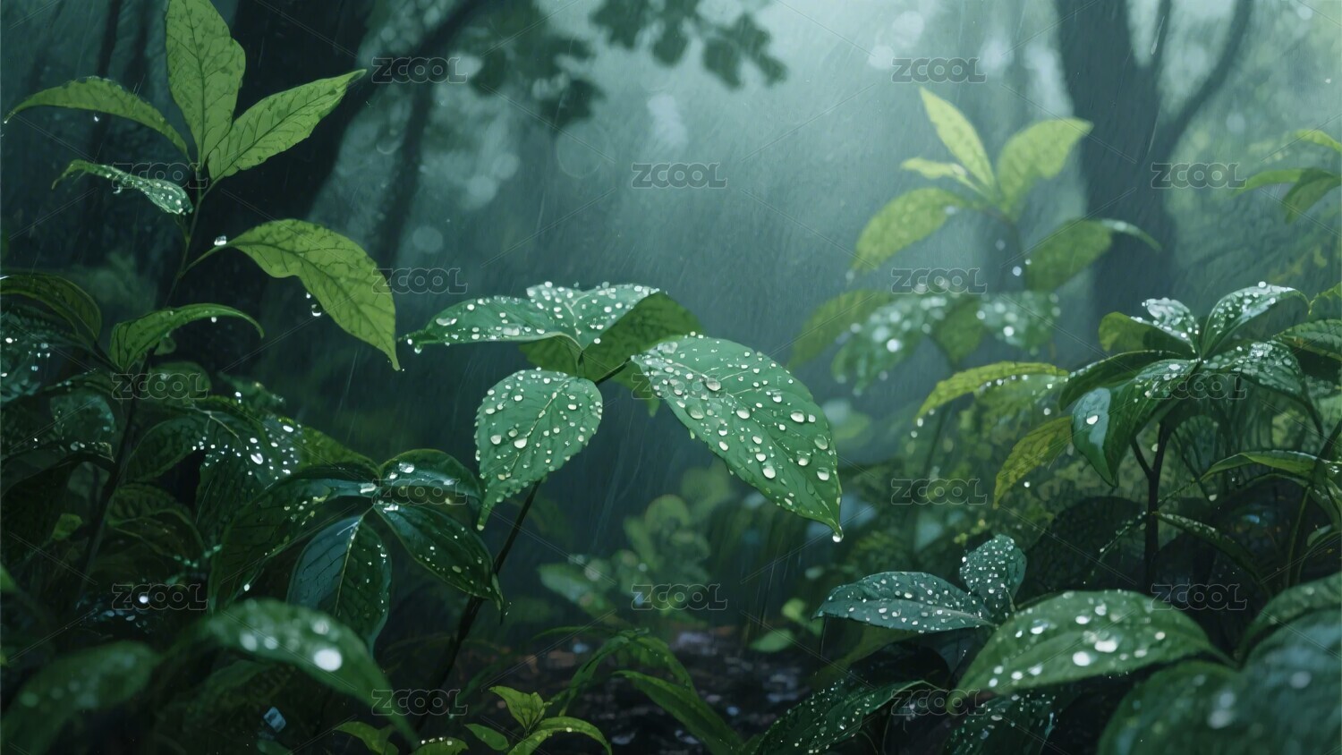 森林,绿叶,雨珠,自然,雾气,插画,风景,植物,湿润,清新