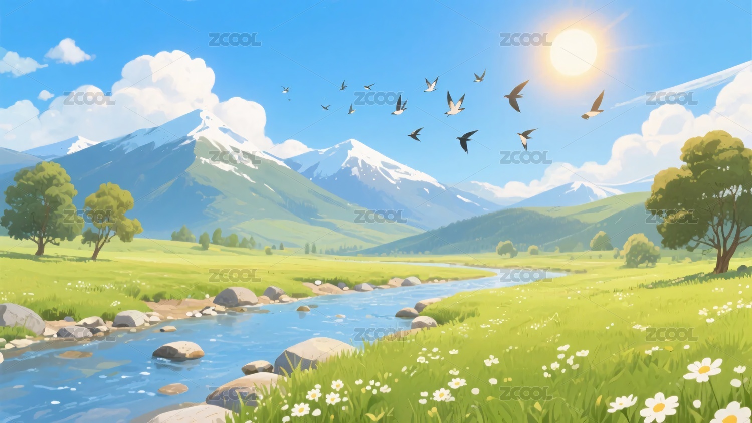 河流,草地,山峰,飞鸟,树木,自然,风景,插画,蓝天,白云
