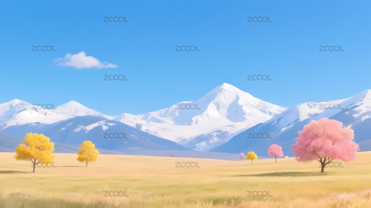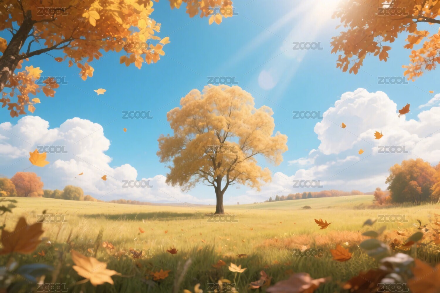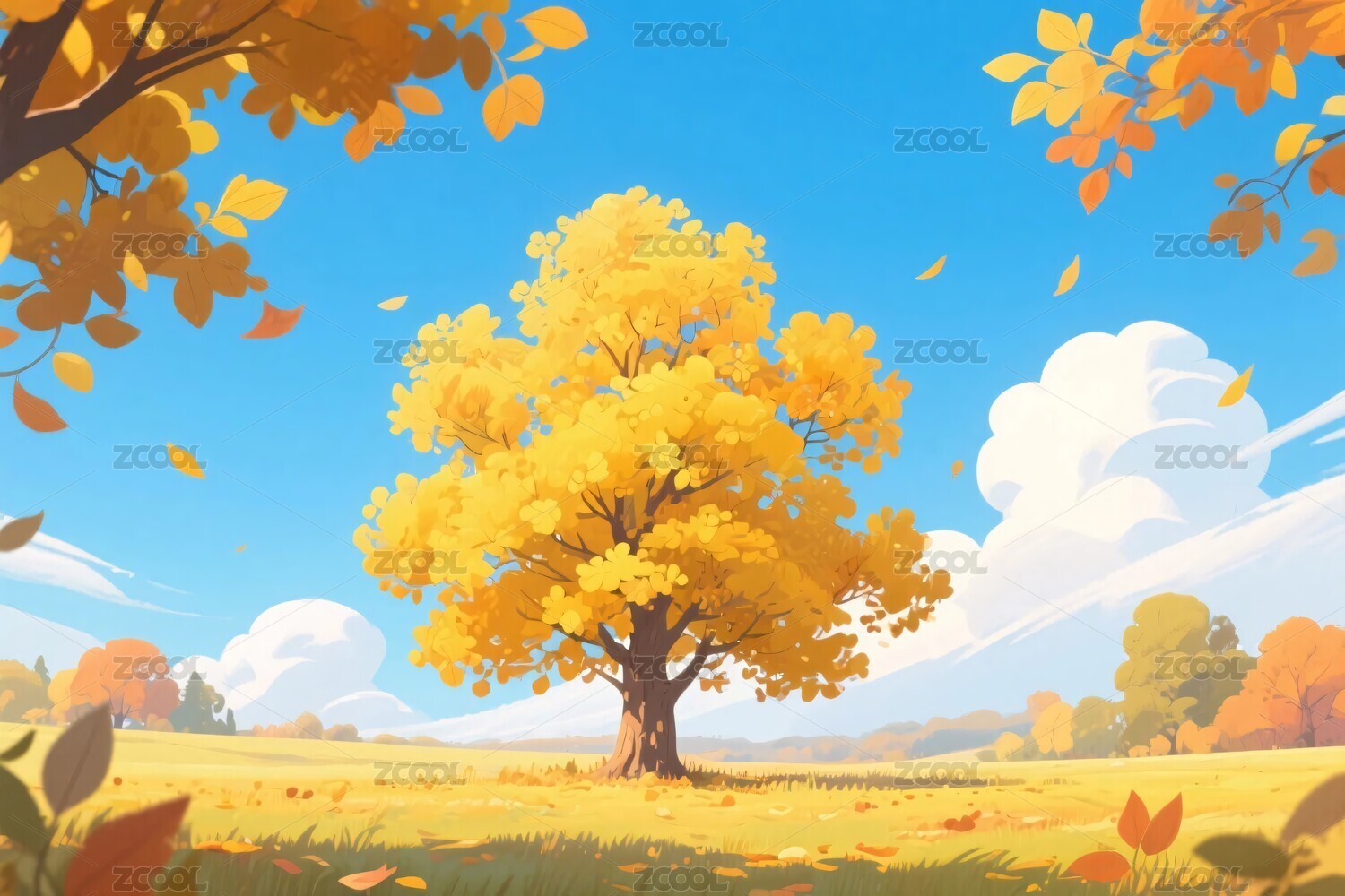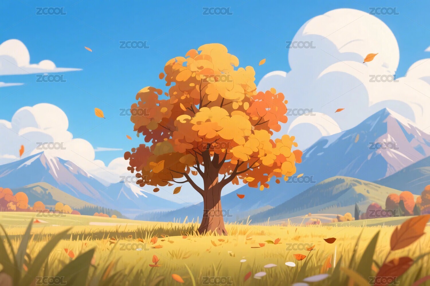 孤树,旷野,山脉,蓝天,白云,插画,风景,自然,秋季,暖色