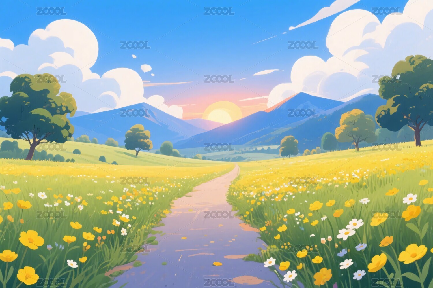 田野,小路,房屋,山峦,白云,蓝天,花草,插画,风景,自然