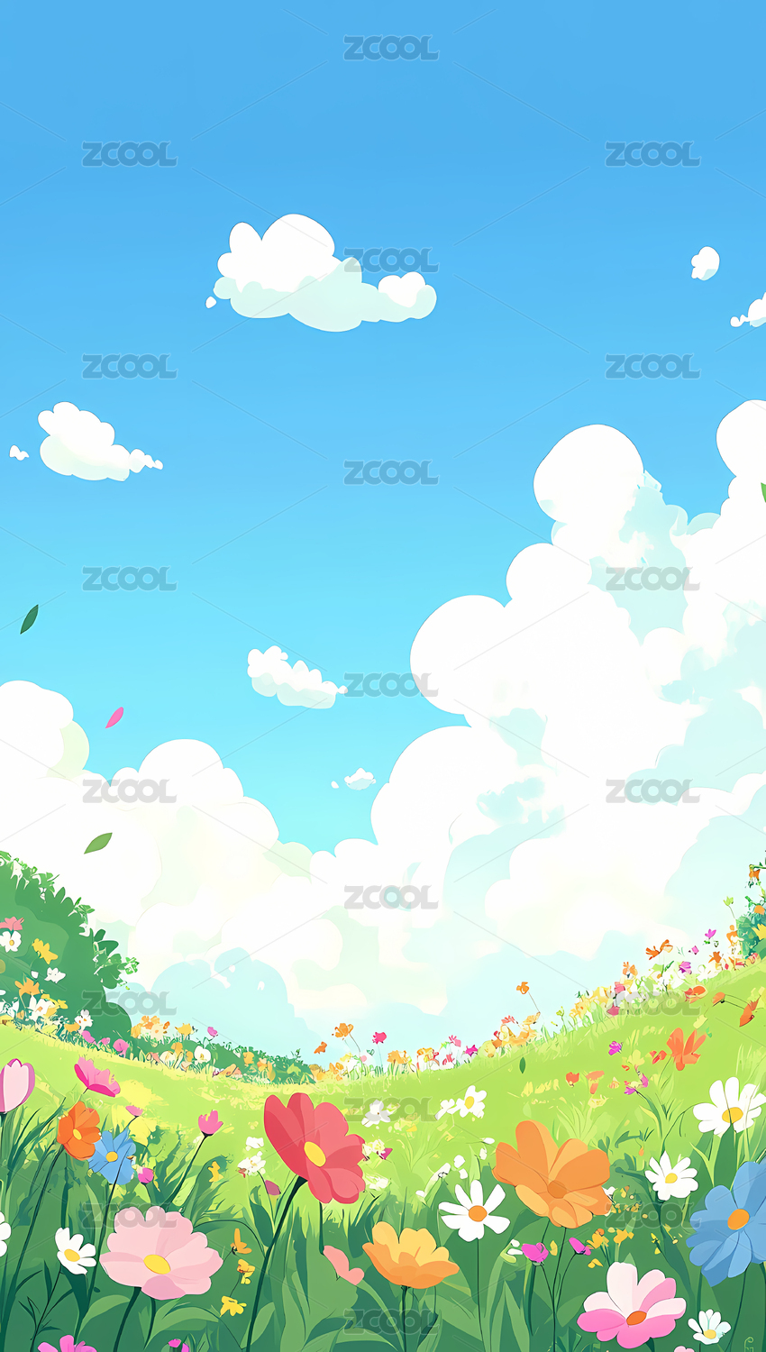 草地,树林,花朵,蓝天,插画,风景,自然,清新,绿色,画面元素