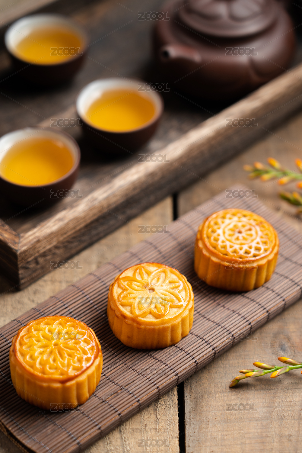 一盘中秋月饼放在中式场景的木质感的桌面上