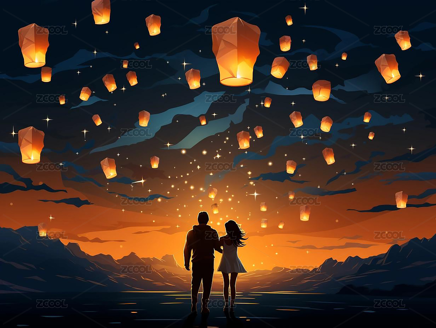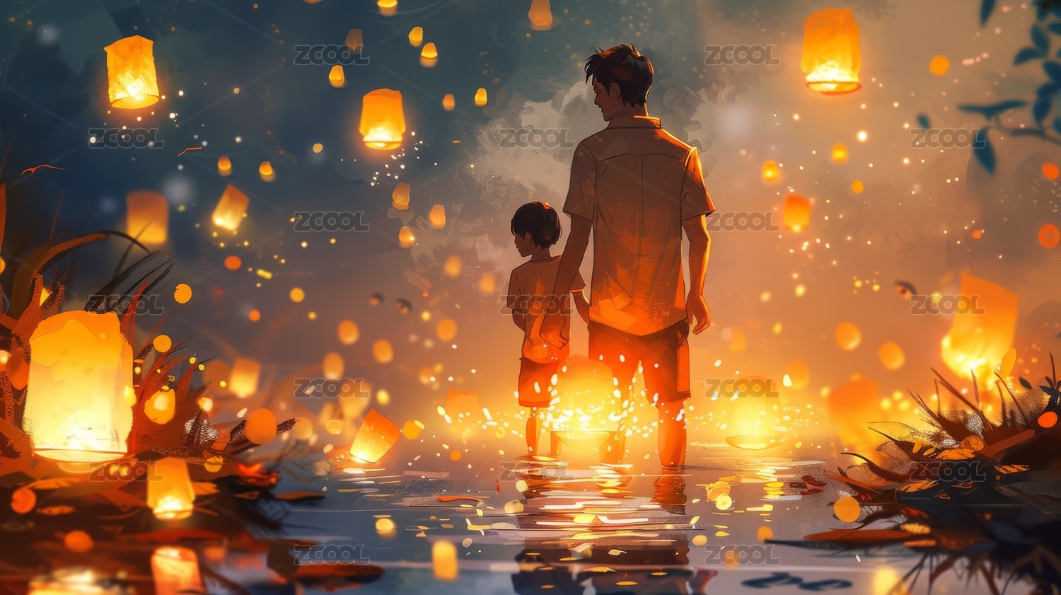 家庭,人物,月亮,孔明灯,夜晚,插画,温馨,场景,亲子,团聚