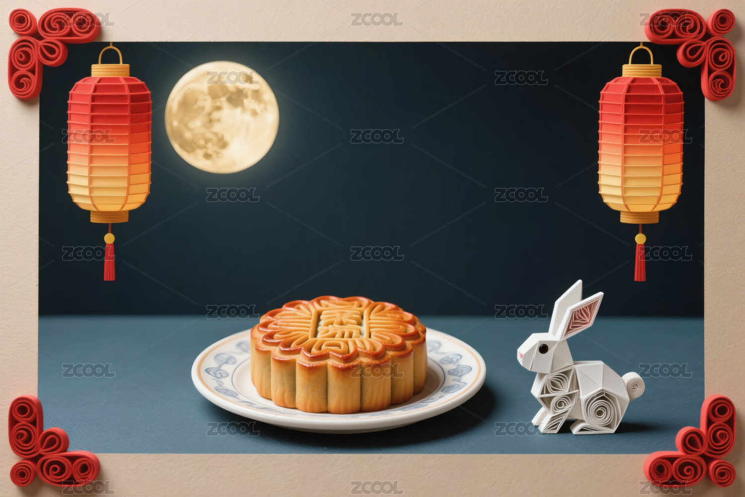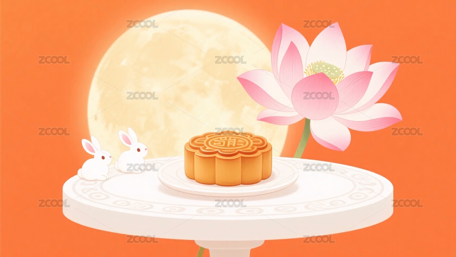 中秋月饼与白兔荷花场景
