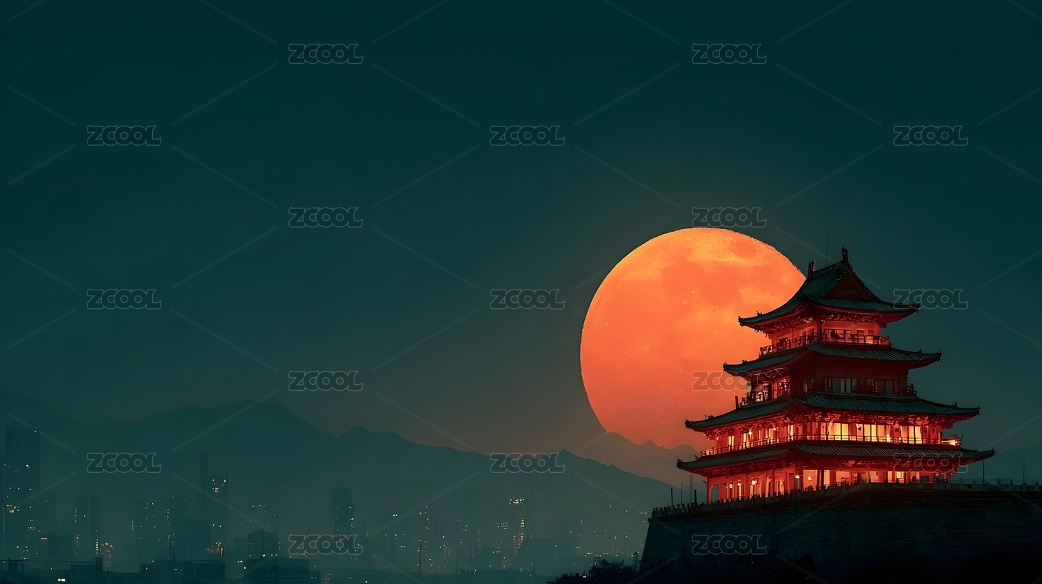 古建筑,月亮,夜色,美景,插画,中式,建筑,景观,自然,夜晚