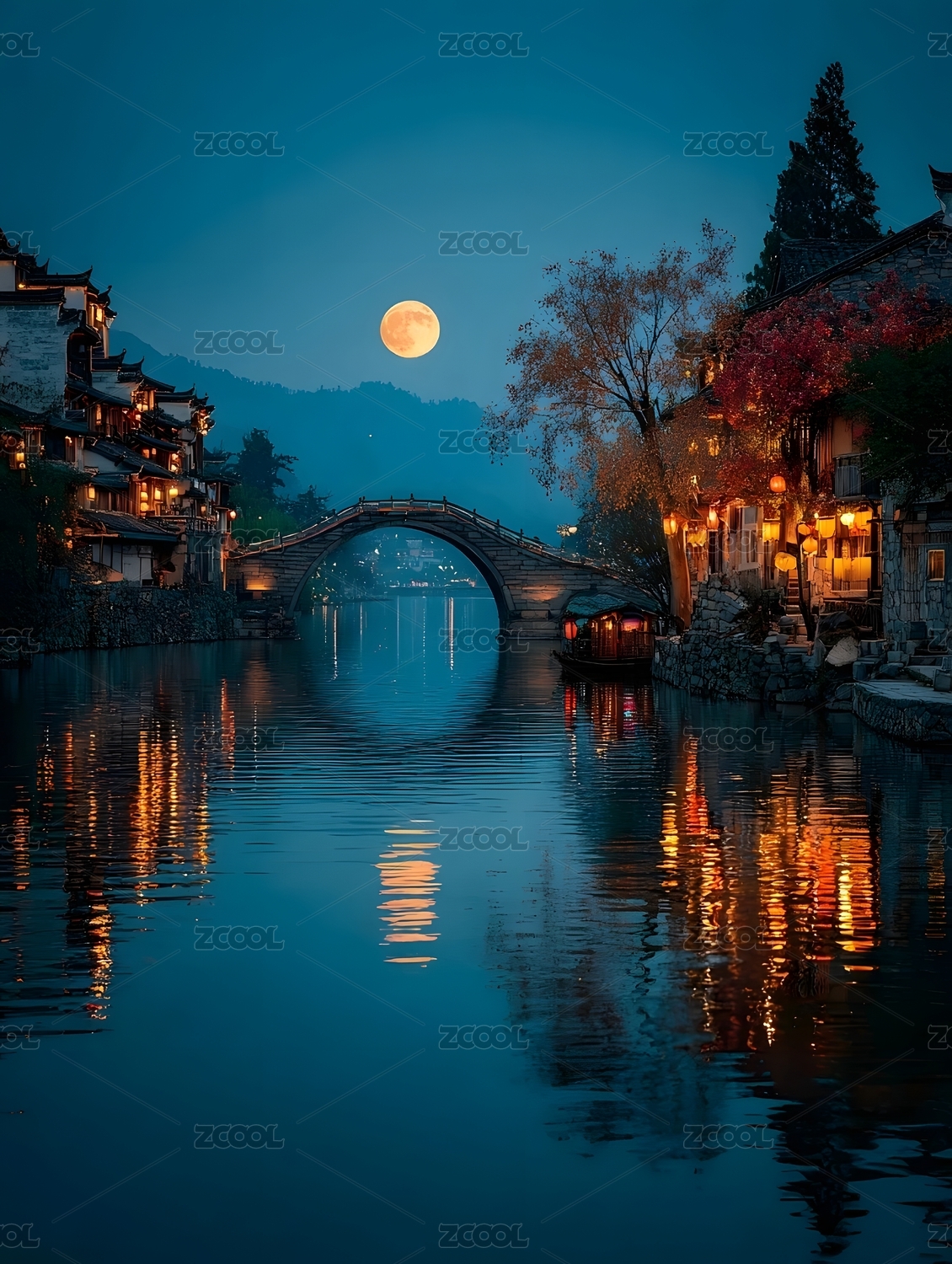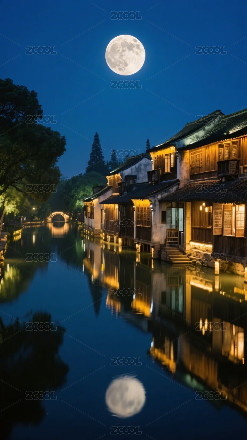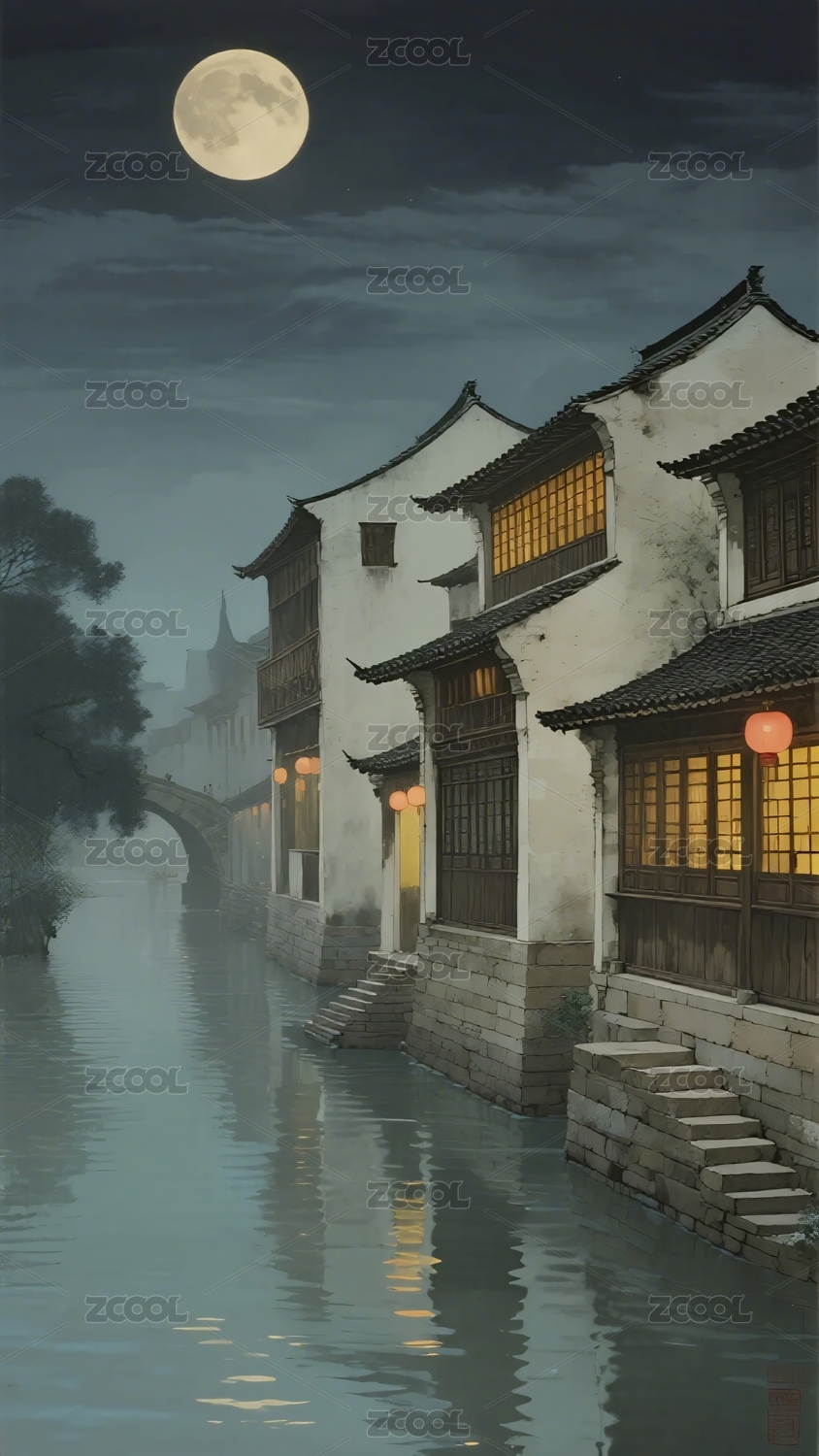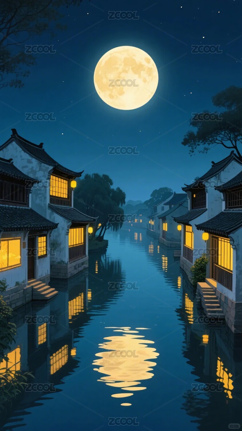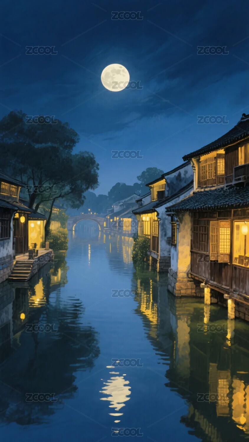 水乡,月夜,房屋,河流,倒影,夜景,插画,静谧,古风,自然