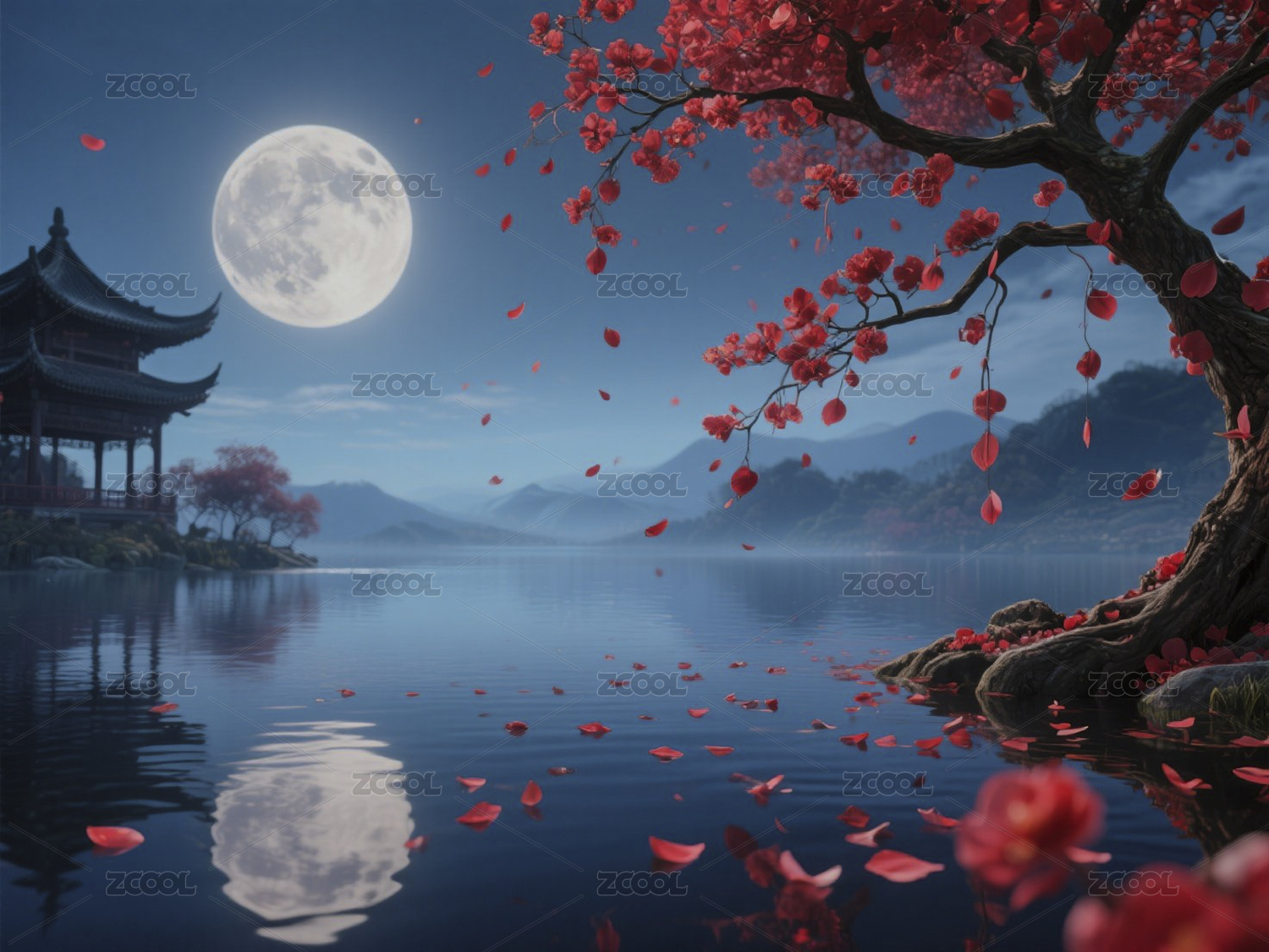 樱花月夜湖景