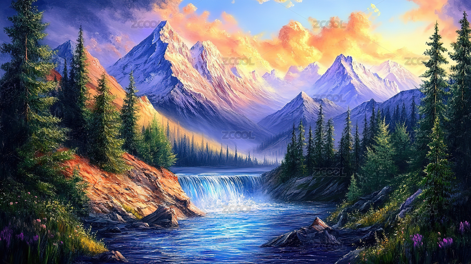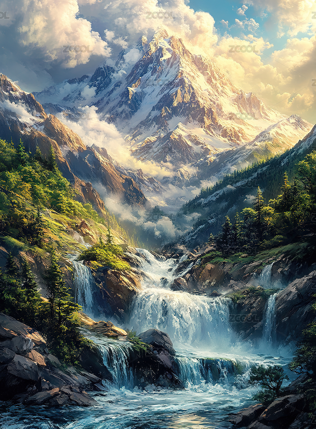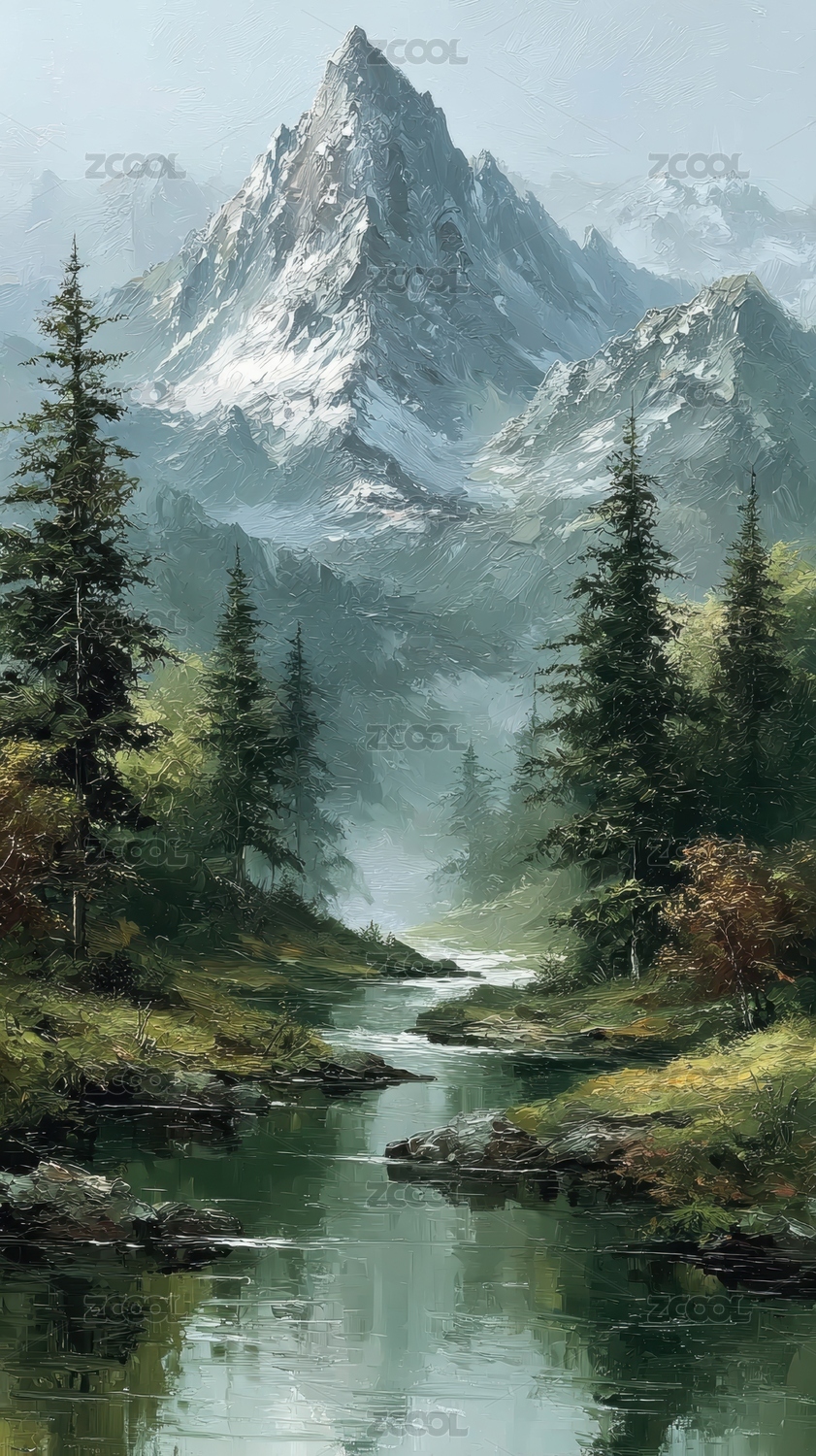 山间静谧的溪流 云雾缭绕的壮丽山峰