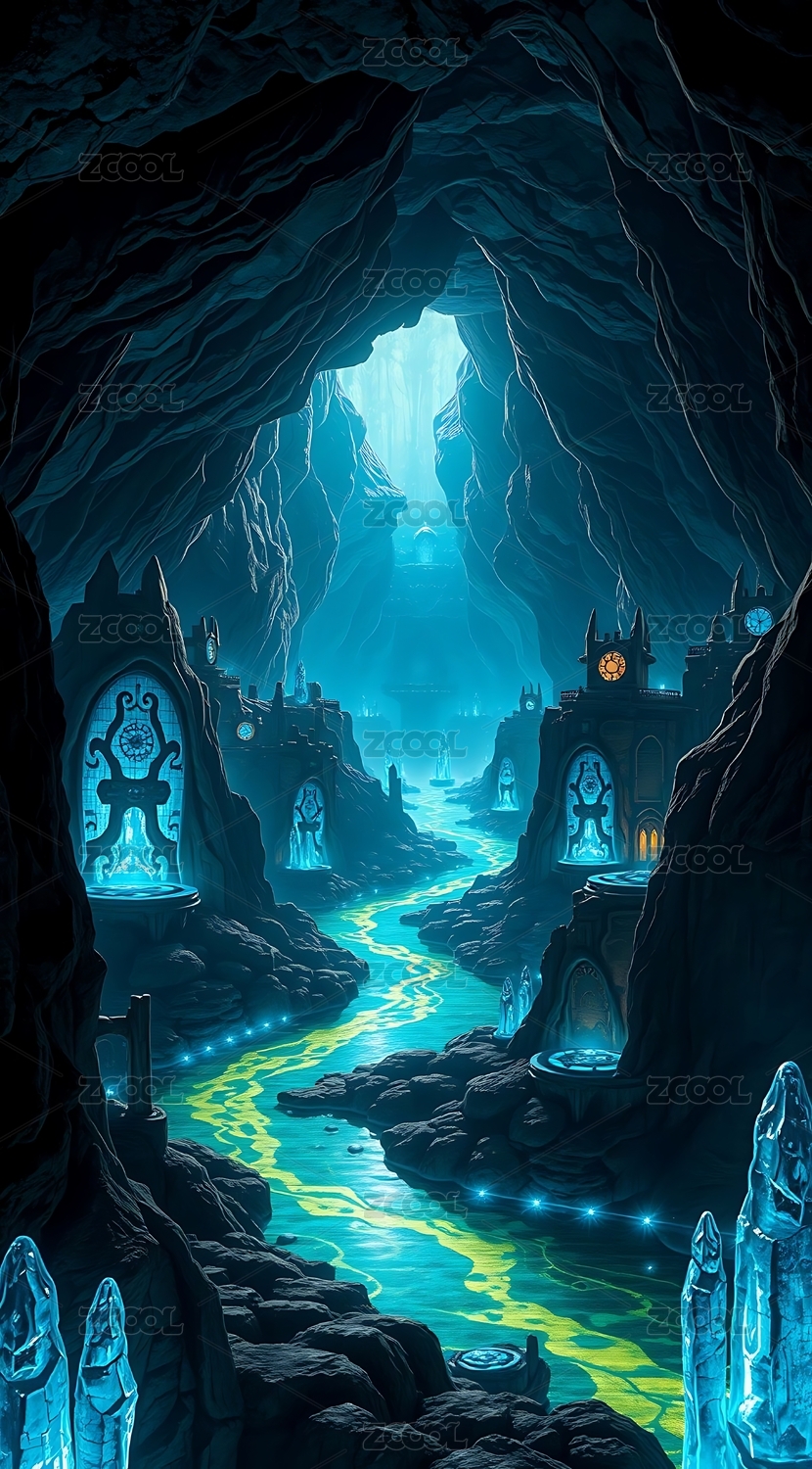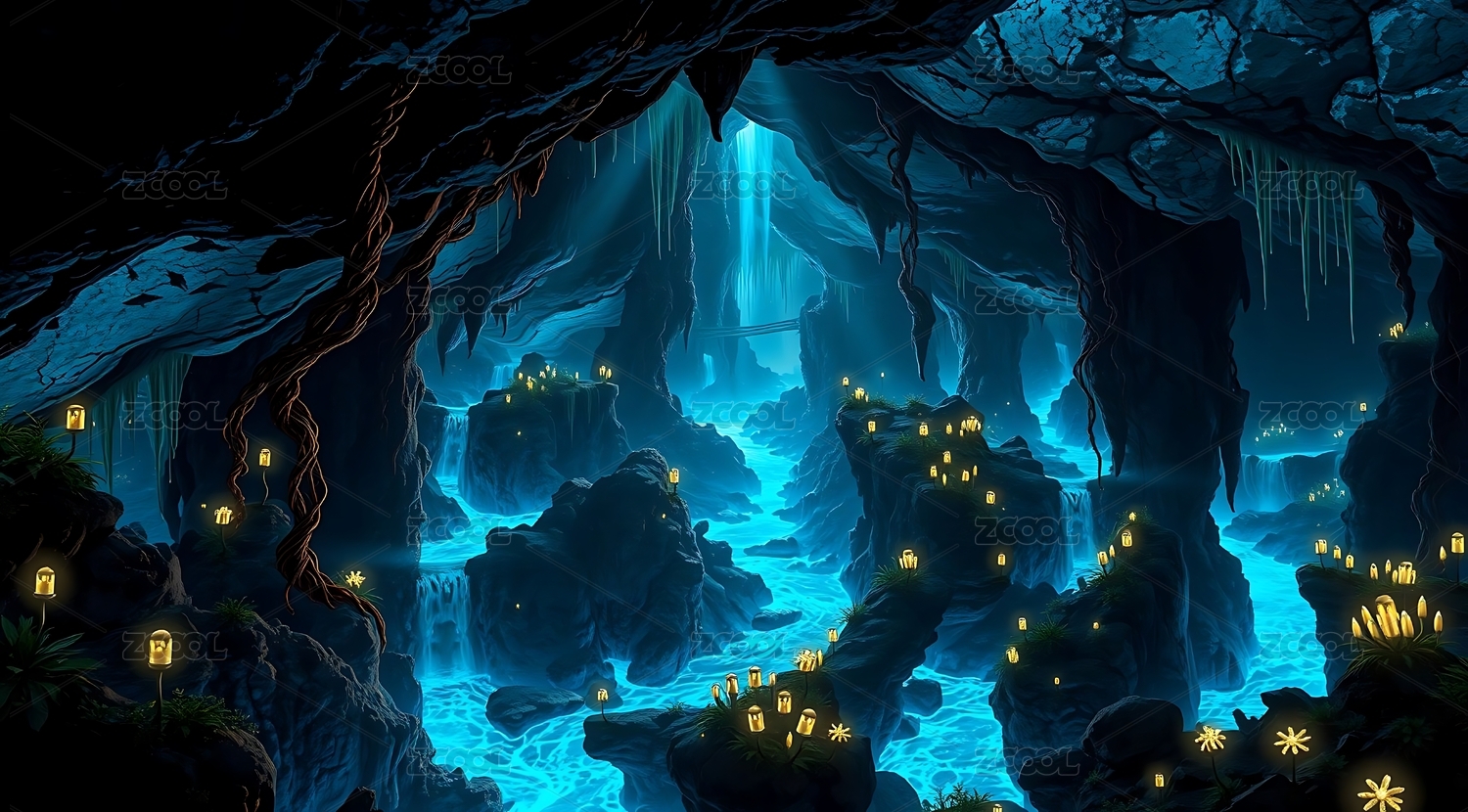 洞穴, 冰柱, 溪流, 岩石, 光线