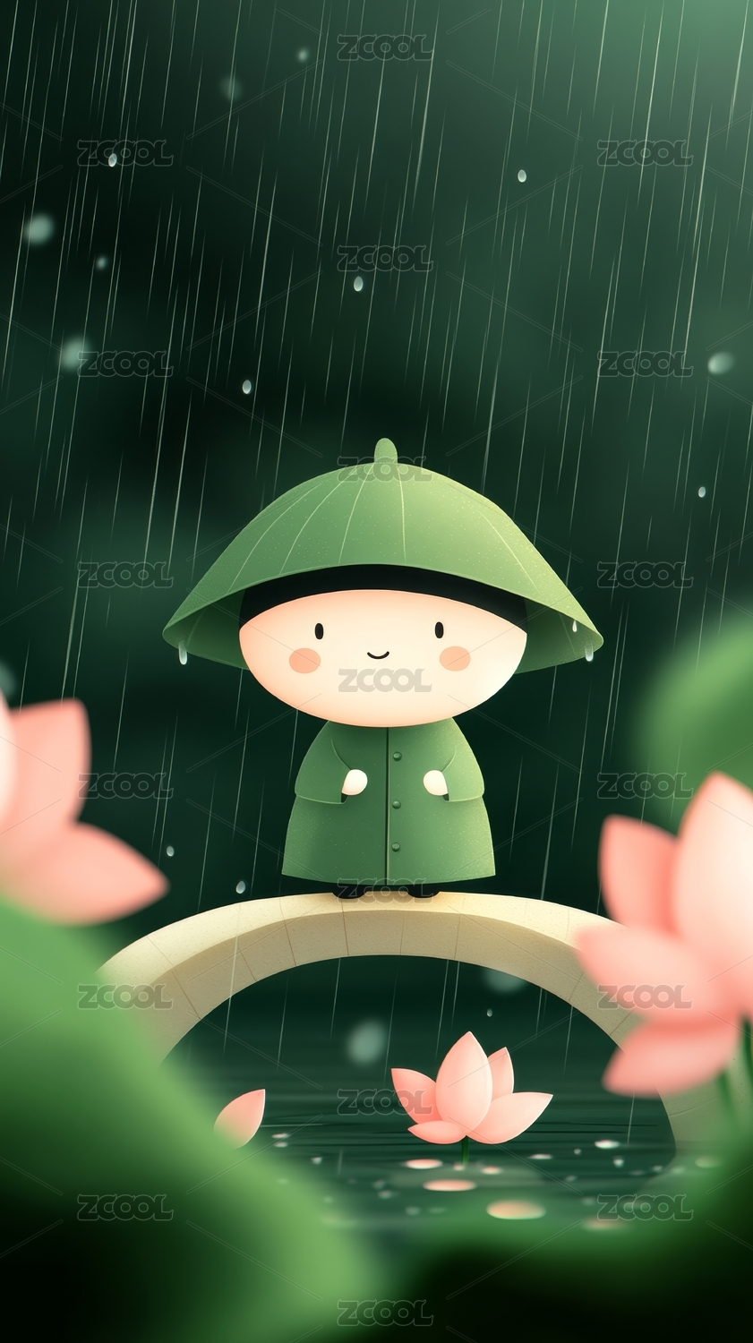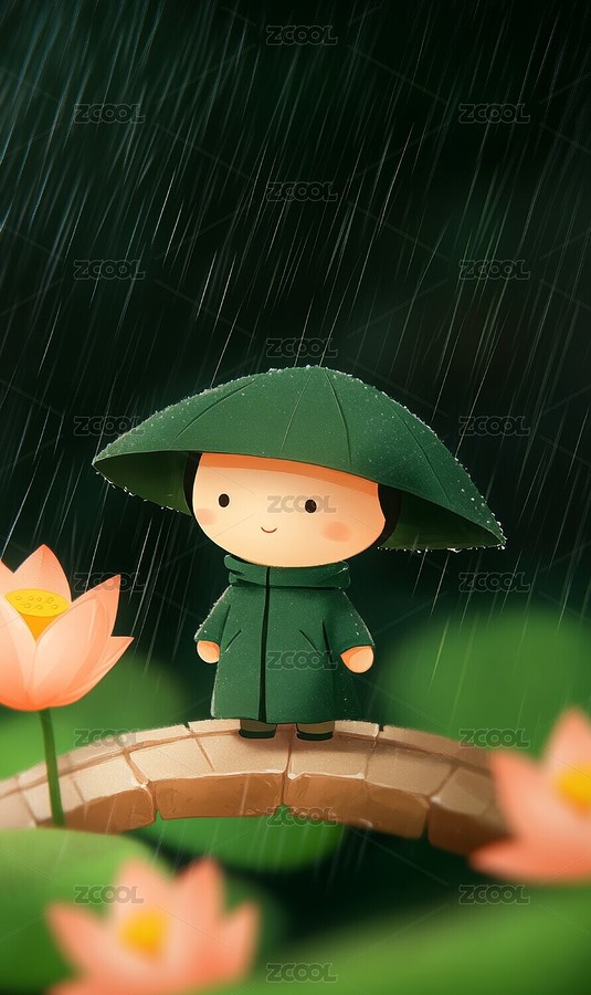 雨中戴帽孩童与莲花