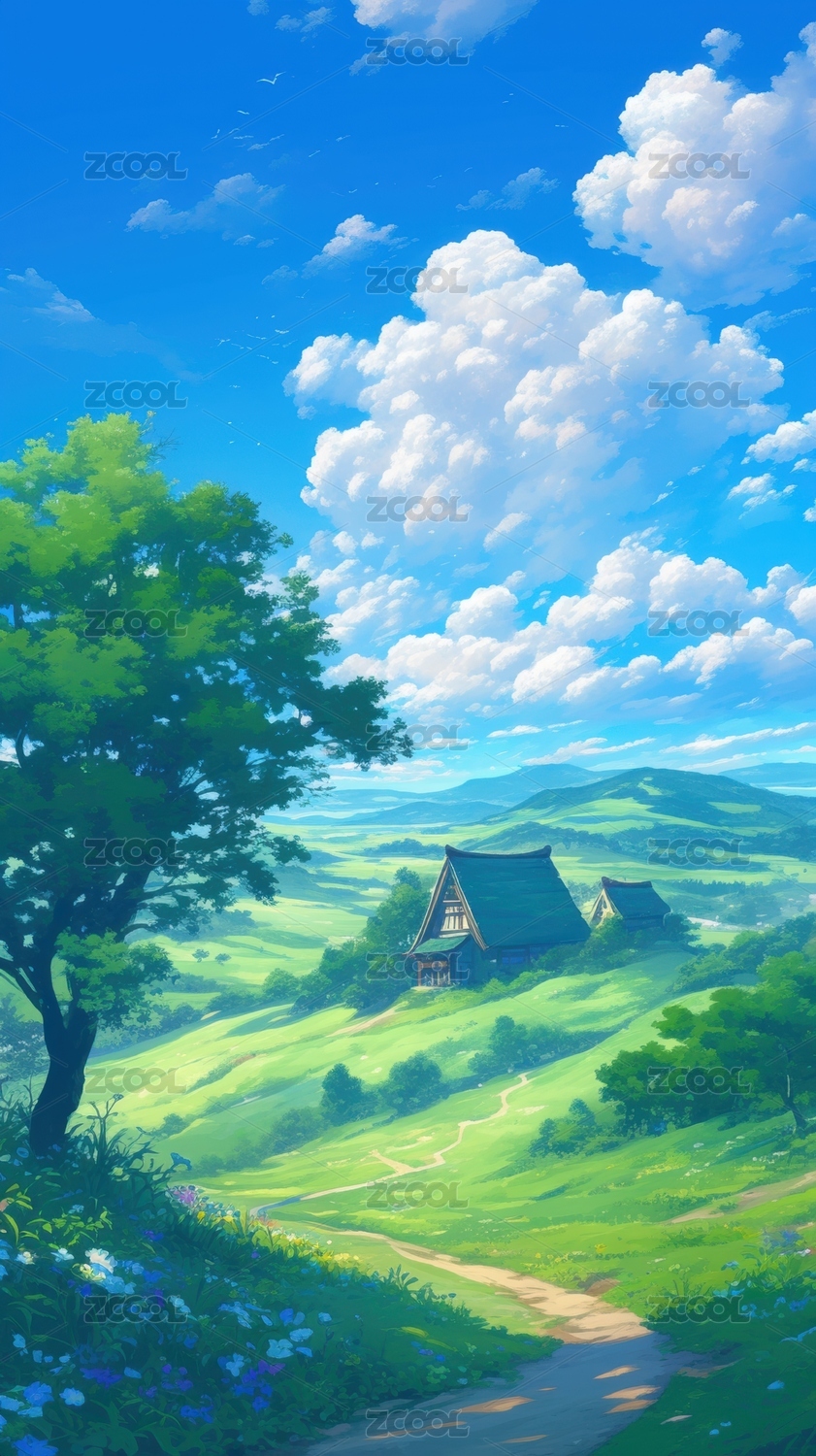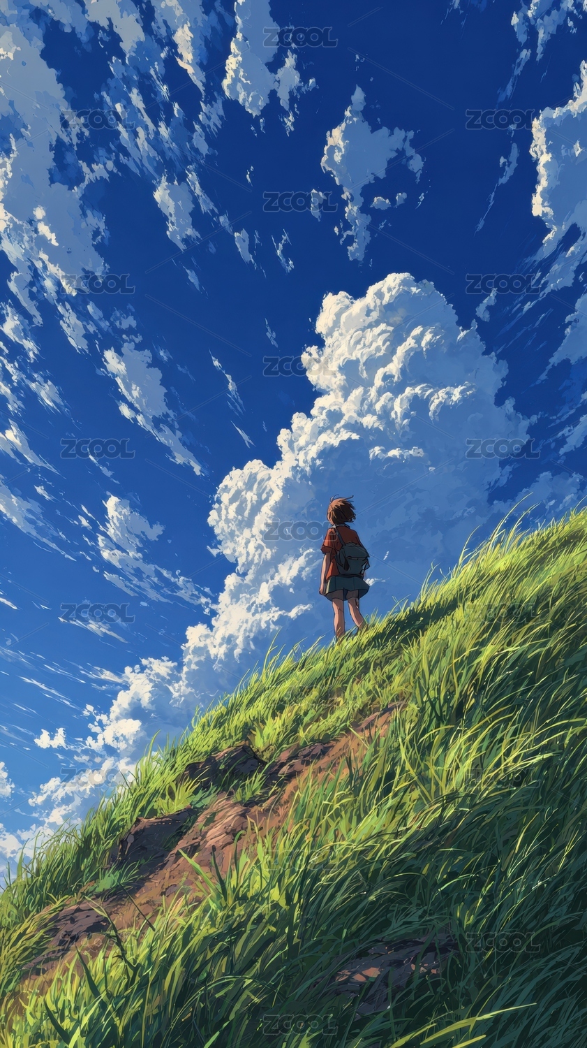 复古日漫风景山谷草地户外高处