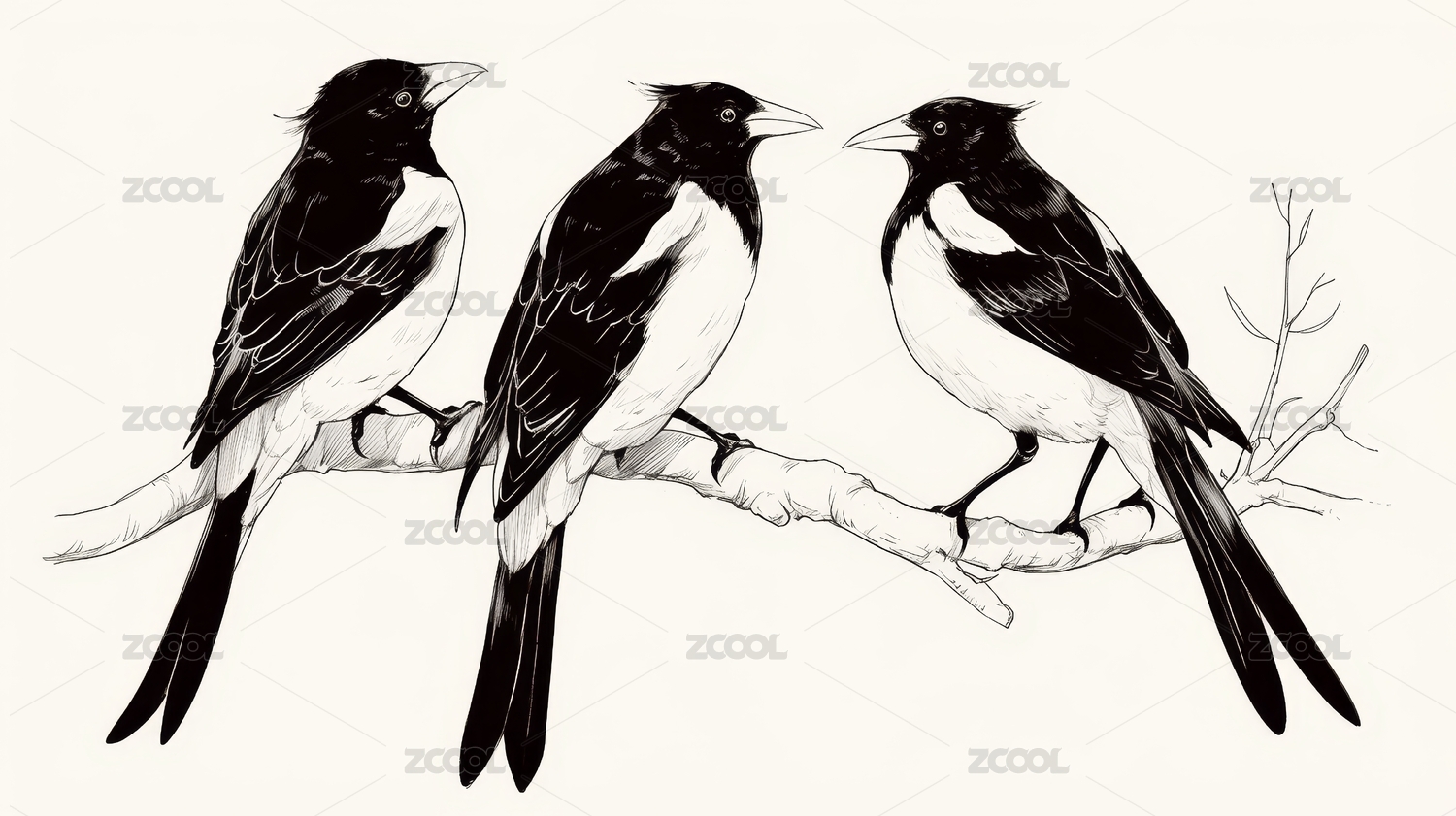 喜鹊,黑白,线稿,插画,鸟类,手绘,艺术,素描,纹理,动物