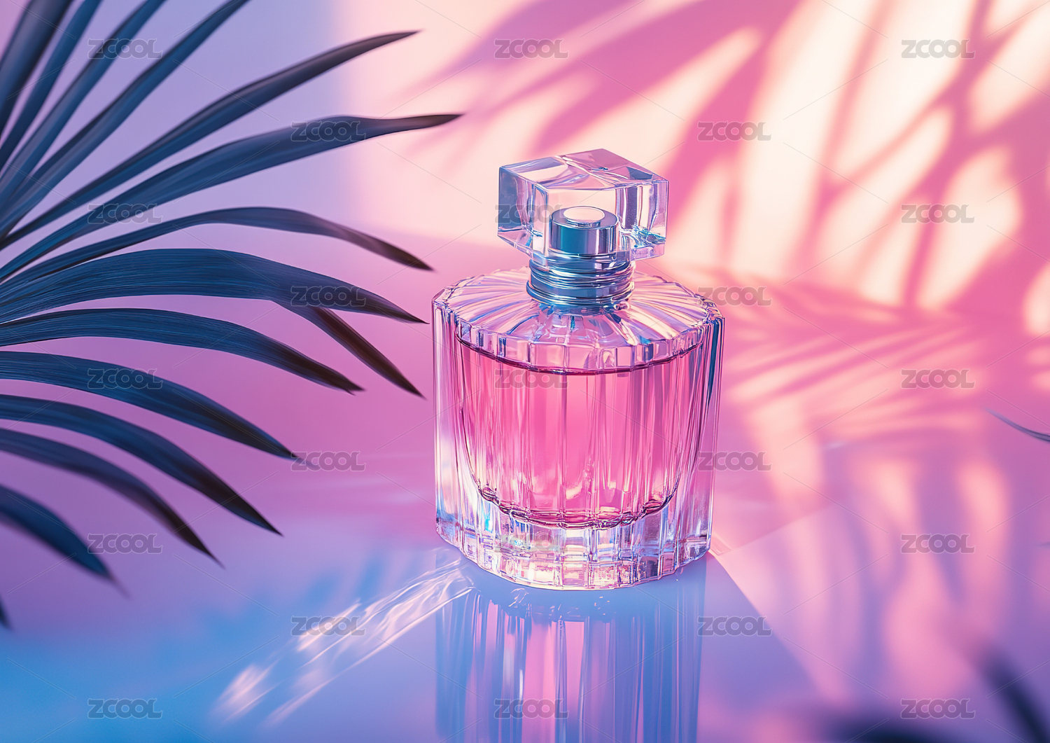 粉蓝光影下的香水瓶