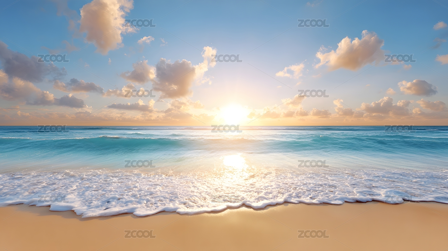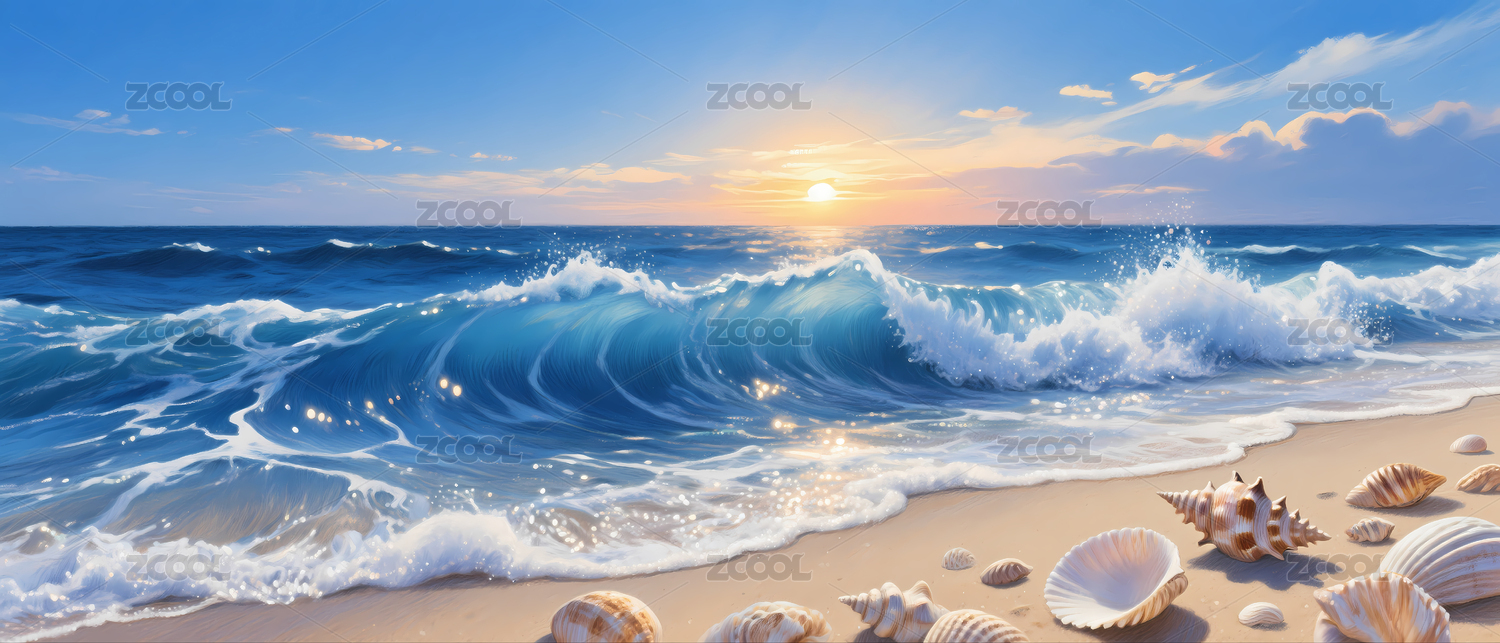 夏天阳光下蓝天白云海边沙滩上的贝壳