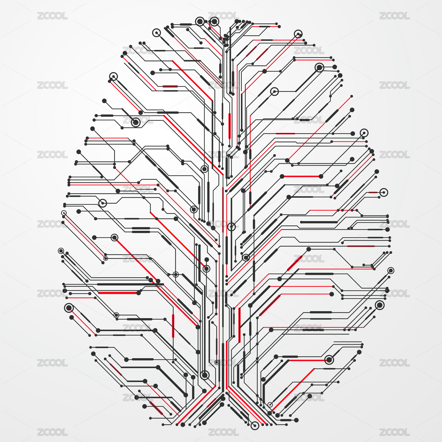 电路板组成的人脑、人类大脑的形状、矢量科技图。