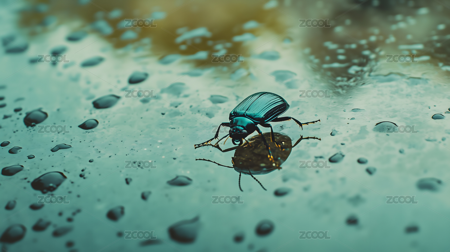 一只虹彩甲虫停驻在半透明水晶叶片上