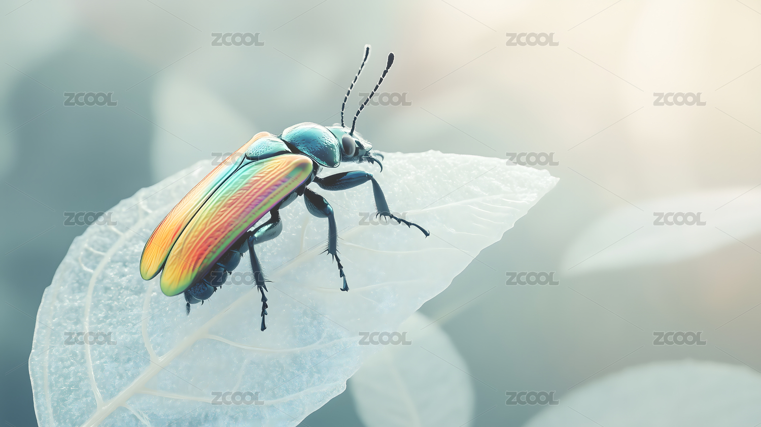 一只虹彩甲虫停驻在半透明水晶叶片上