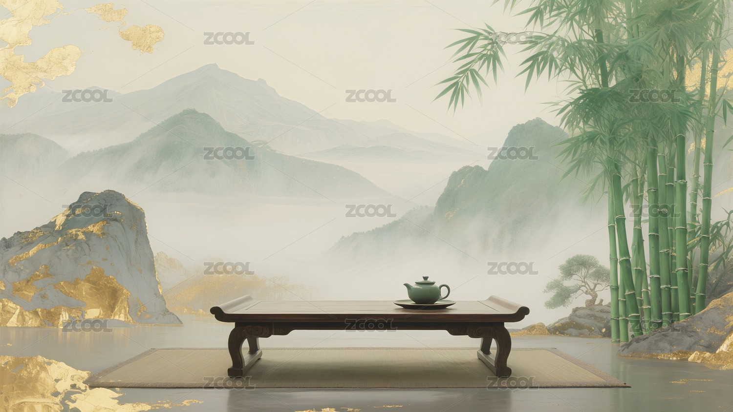 太湖石假山白梅花注碗茶壶茶杯祥云国风插画