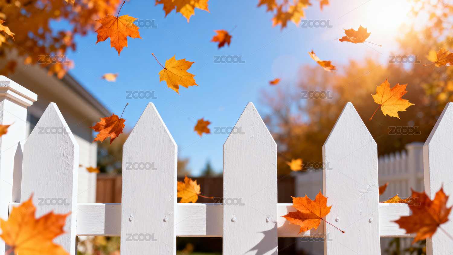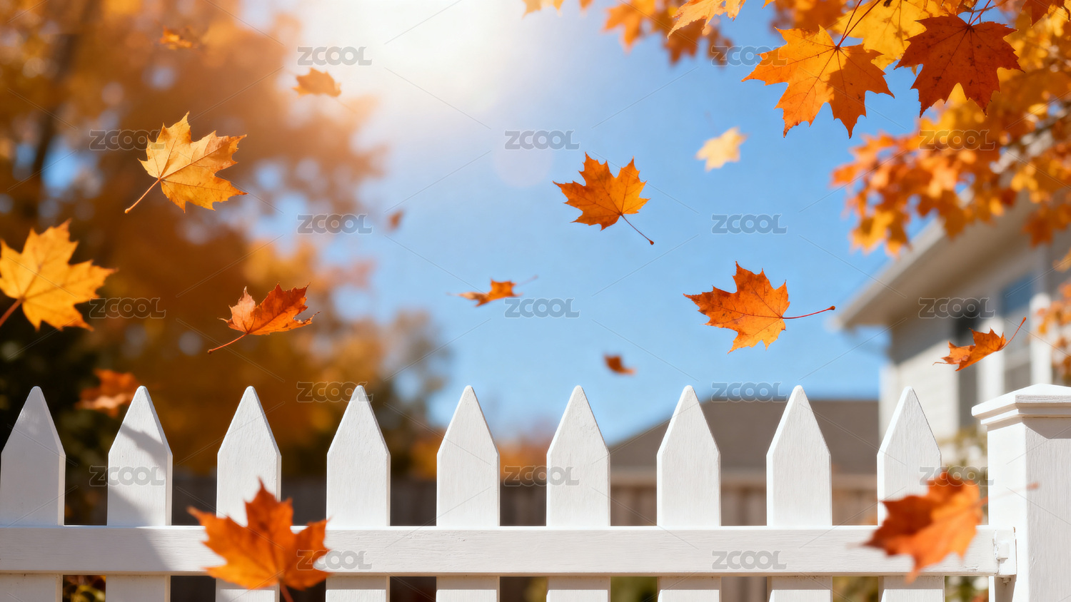 秋日庭院枫叶飘落白色栅栏