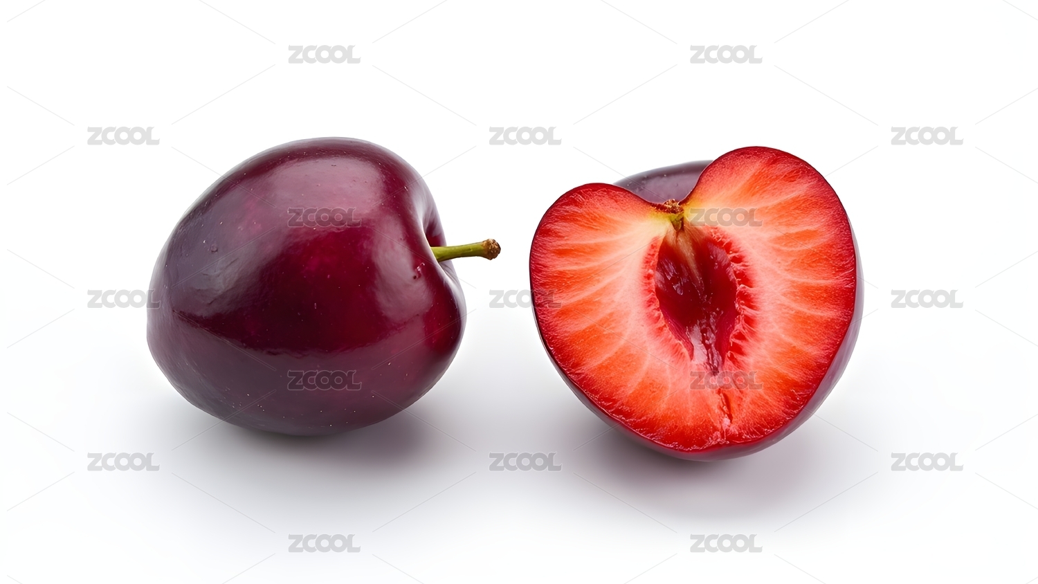 美国杏李恐龙蛋和切开果肉带绿叶子白底