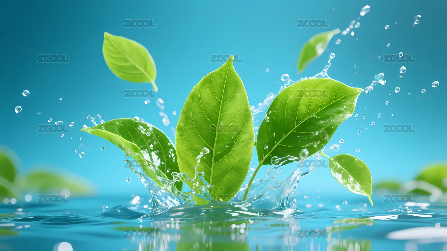 带水珠的薄荷叶和水面倒影美容护肤海报元素