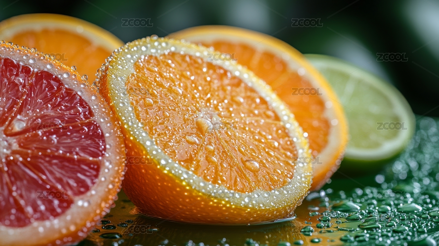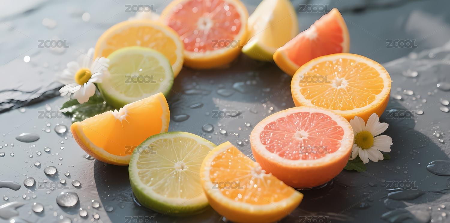 新鲜切片的柑橘类水果与水珠