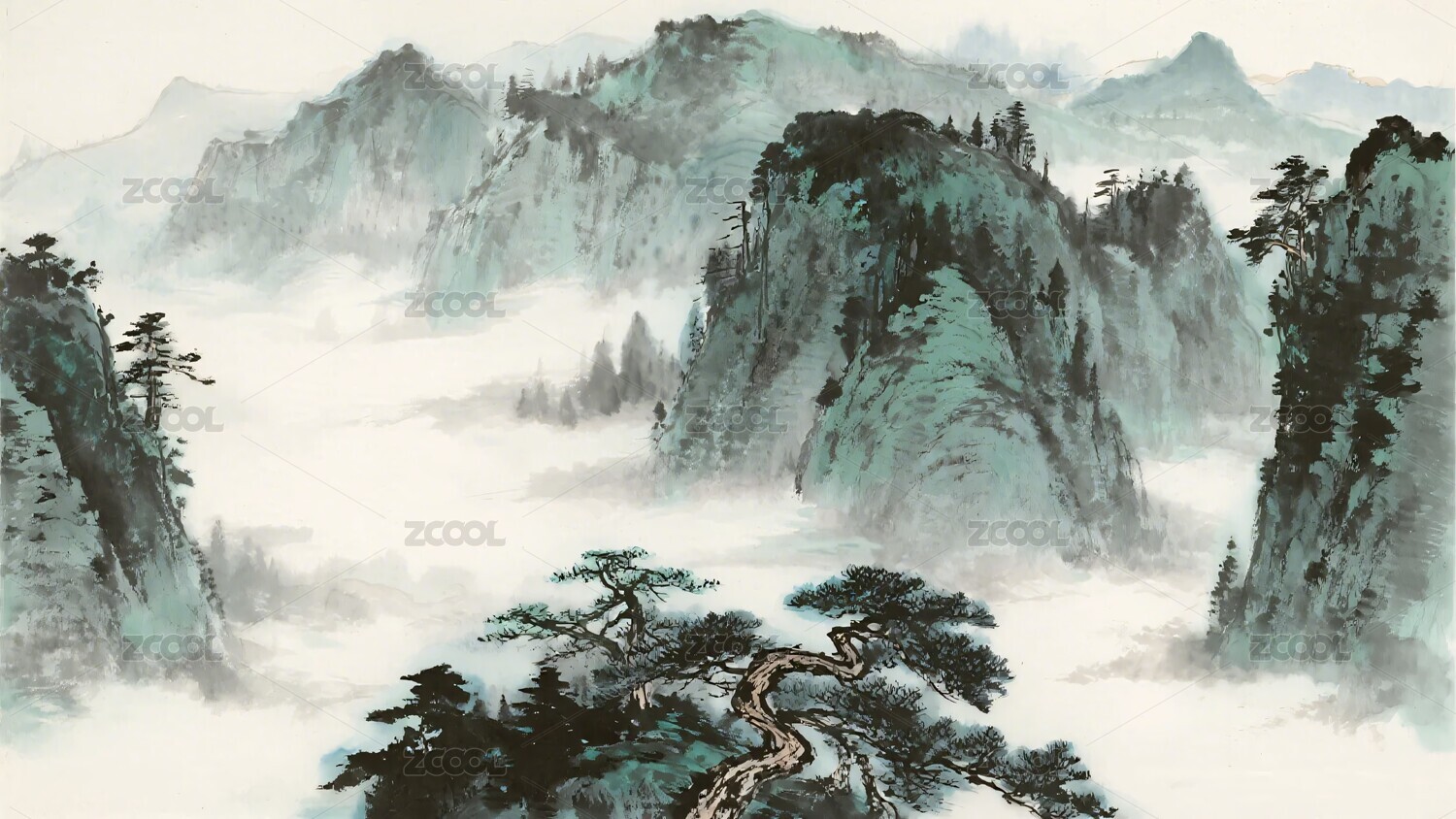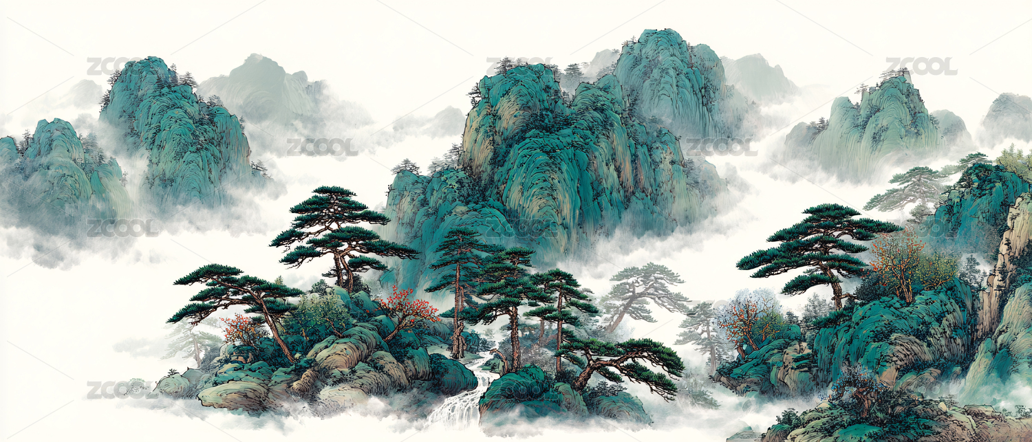景观,远山,青绿山水,留白,云雾,水墨,泼墨,写意,山水画,山峰