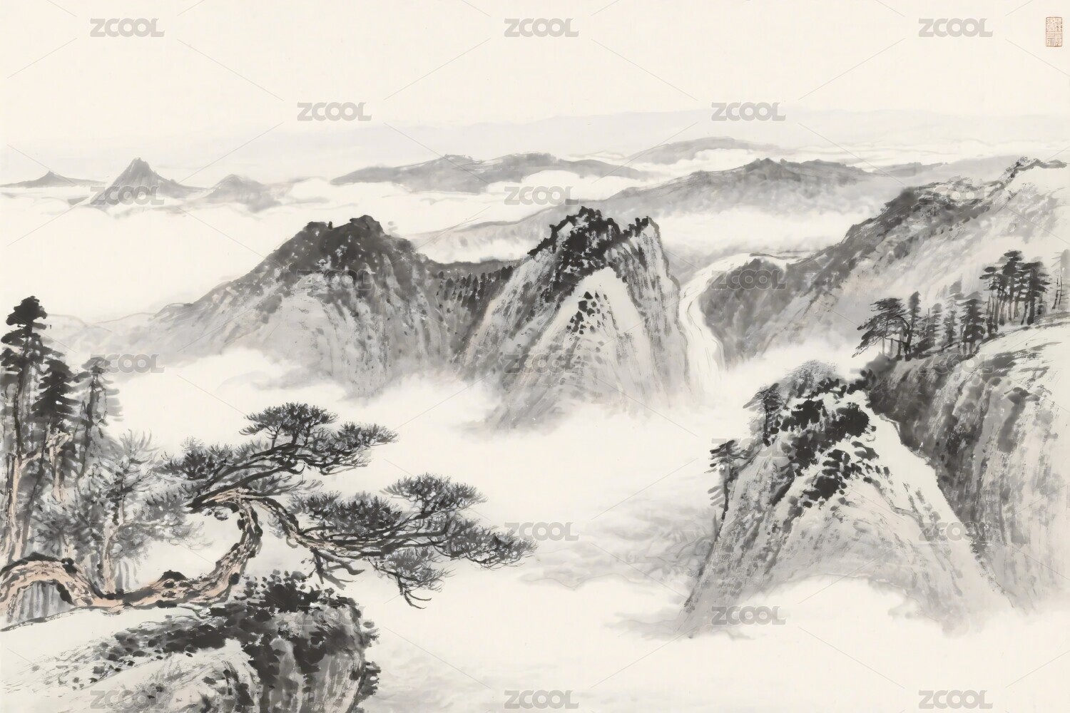 水墨风格山峦云雾松树图