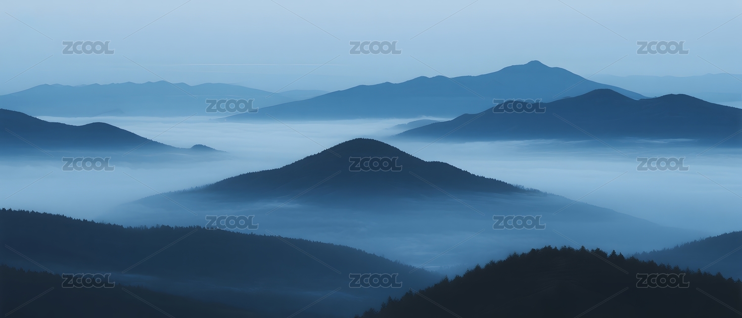 深蓝薄雾连绵山峦