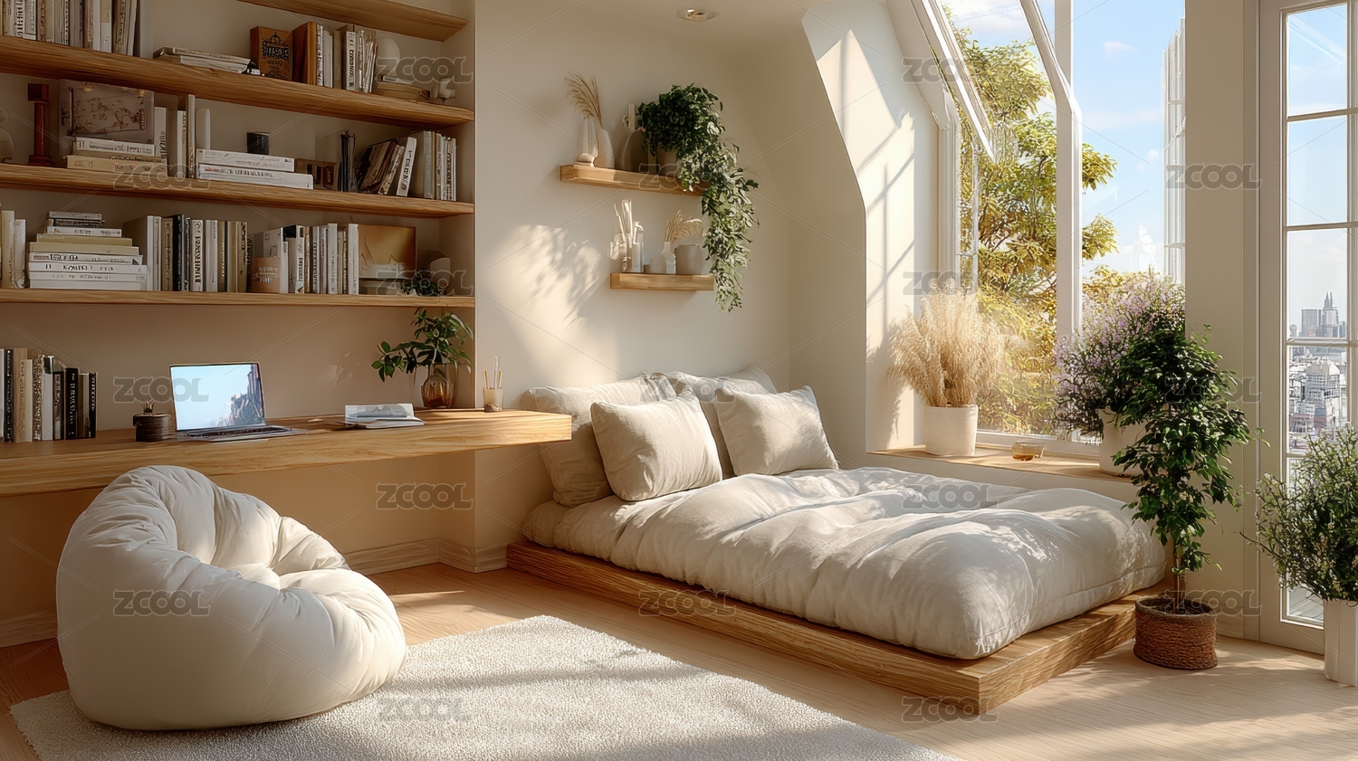 卧室,窗户,植物,窗帘,阳光,美景,室内场景,家居,温馨,自然