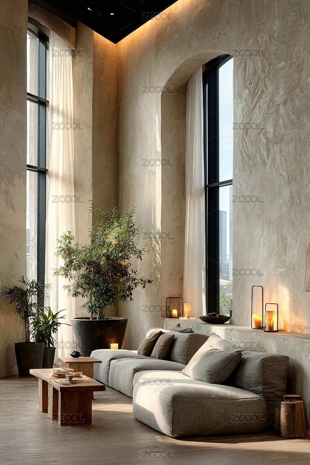客厅,沙发,茶几,绿植,台灯,花瓶,弧形墙,木质元素,玻璃窗,室内设计