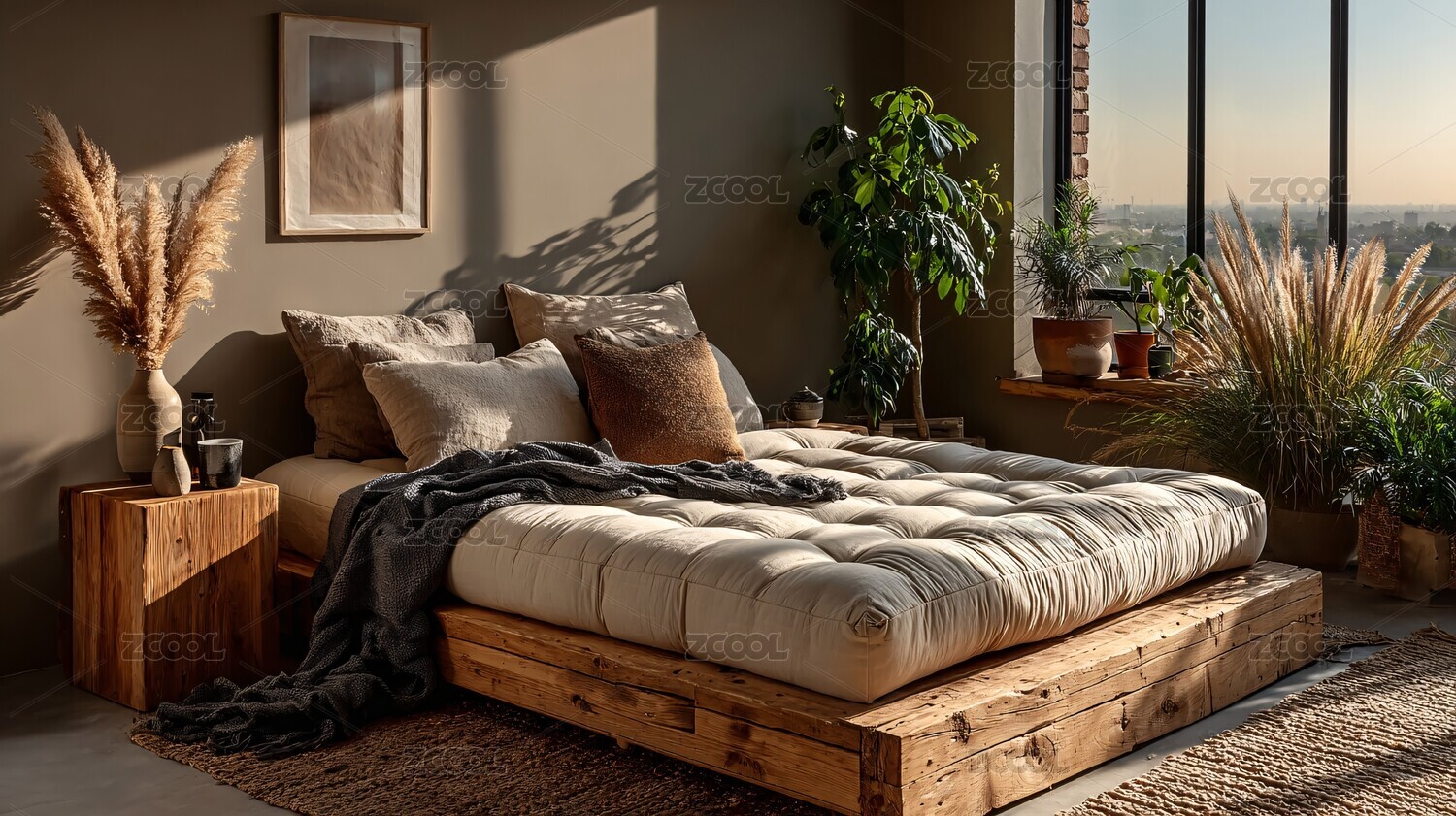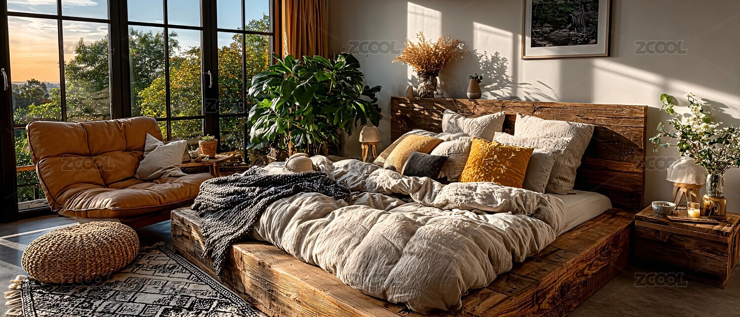 卧室,绿植,窗户,装饰画,抱枕,毯子,木质元素,室内场景,家居,自然风