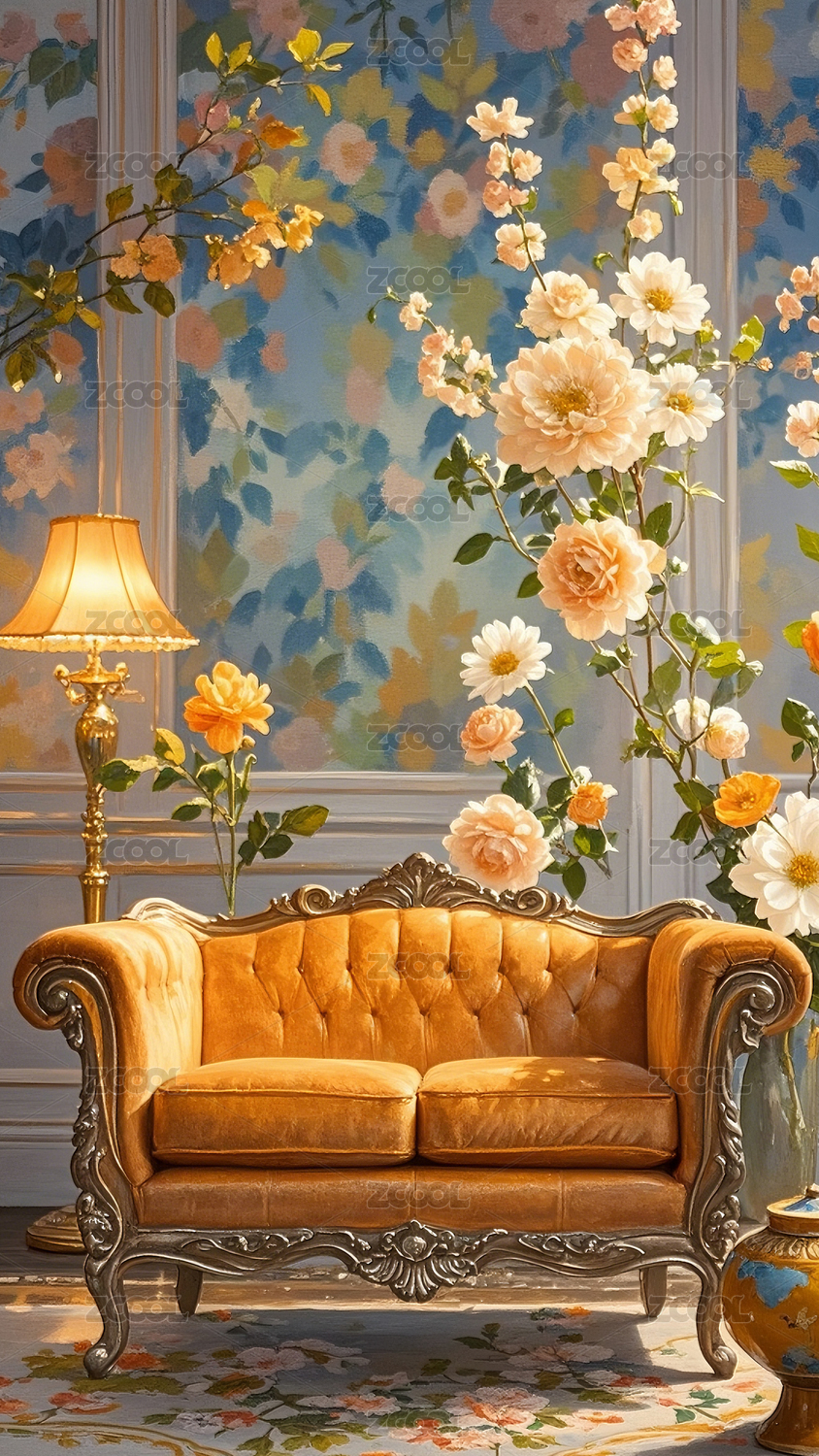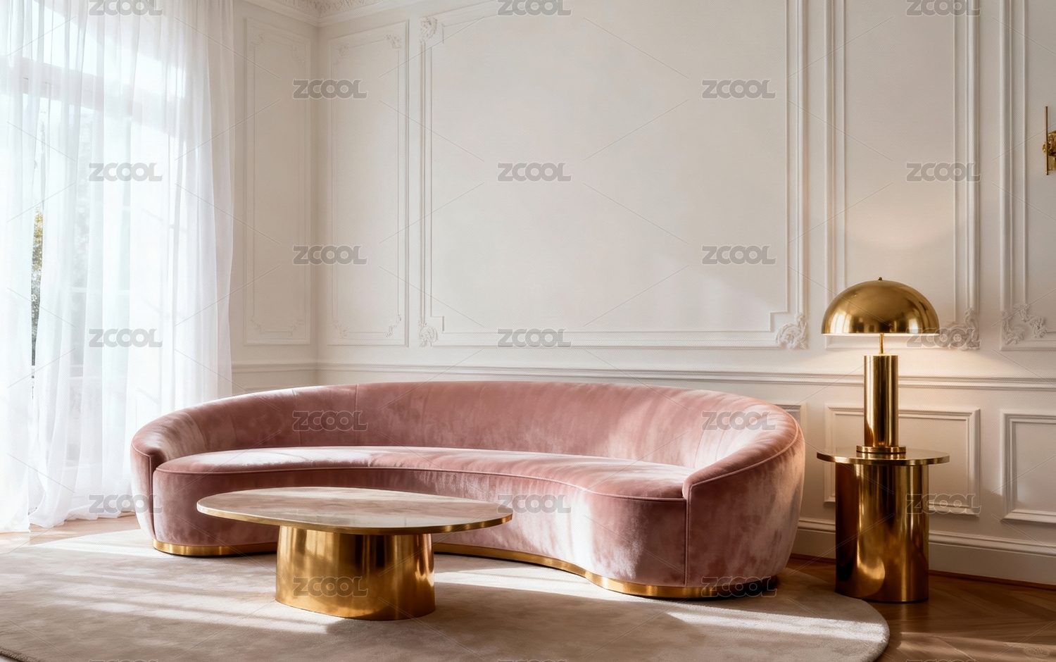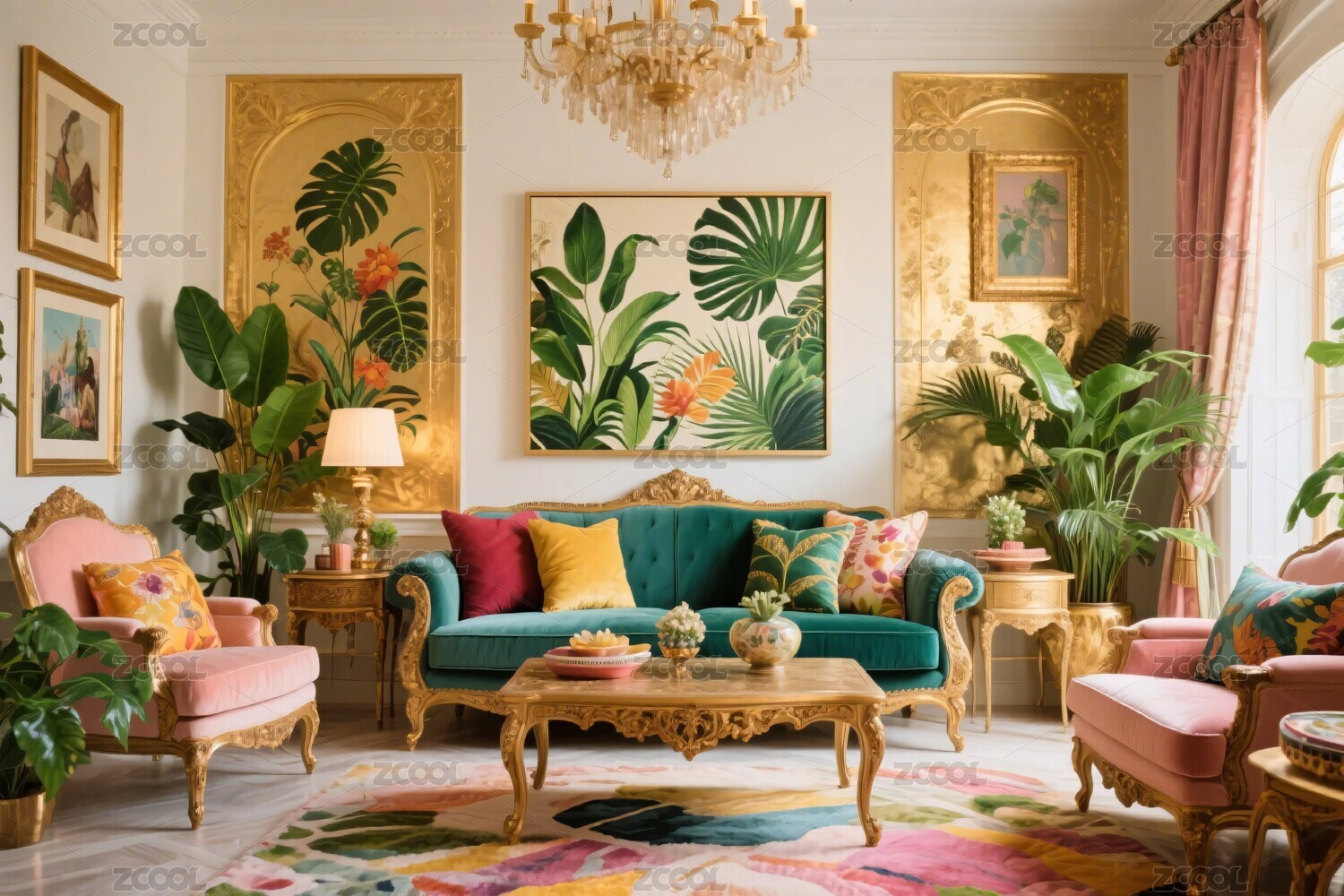 粉色沙发,金色装饰,鲜花装饰,大衣柜,装饰画,沙发,室内空间,奢华,优雅,复古
