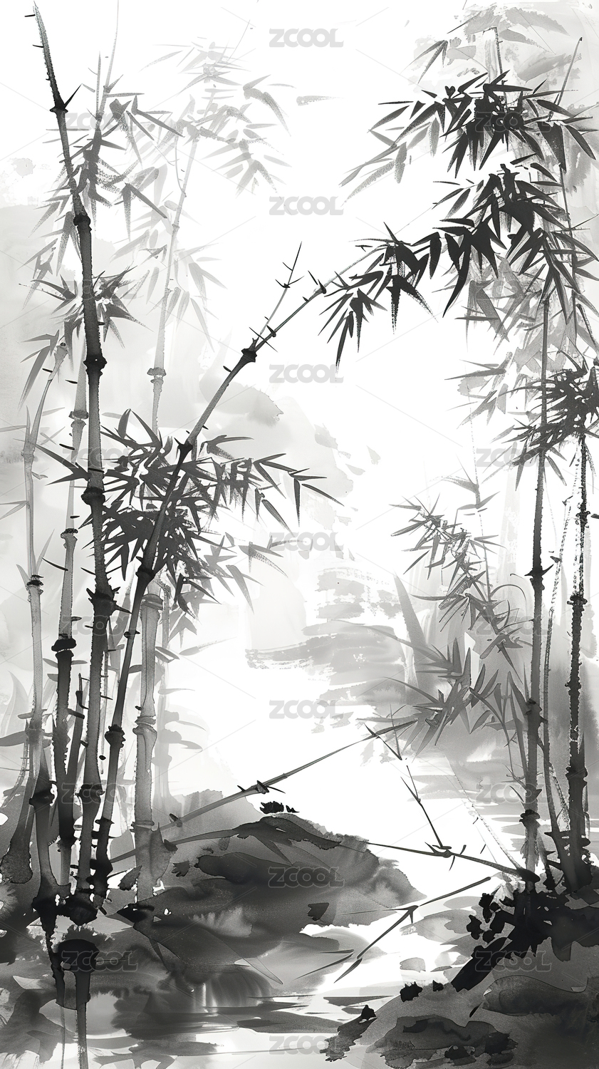 水墨画竹林与岩石