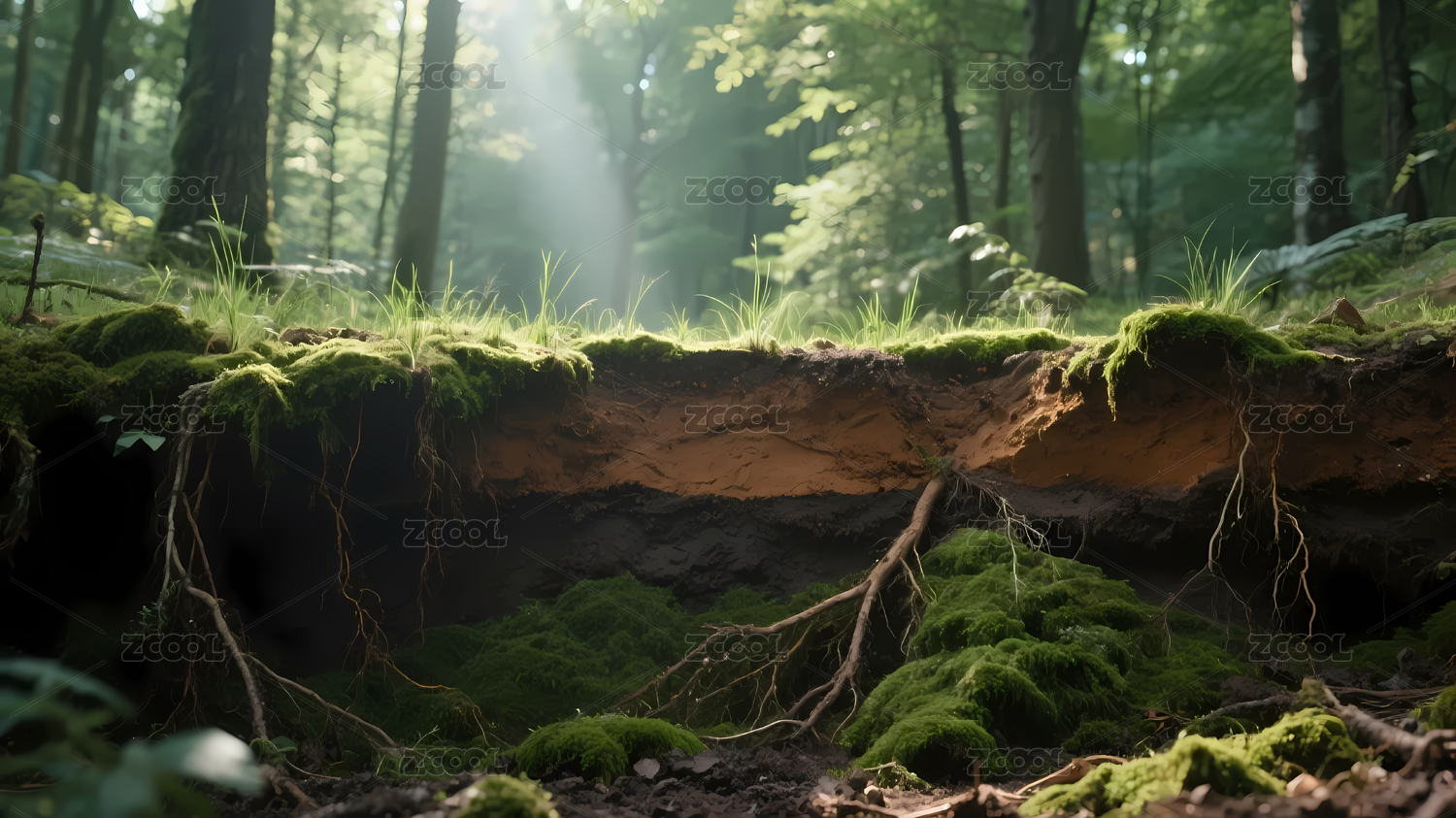 露出树根青苔森林景
